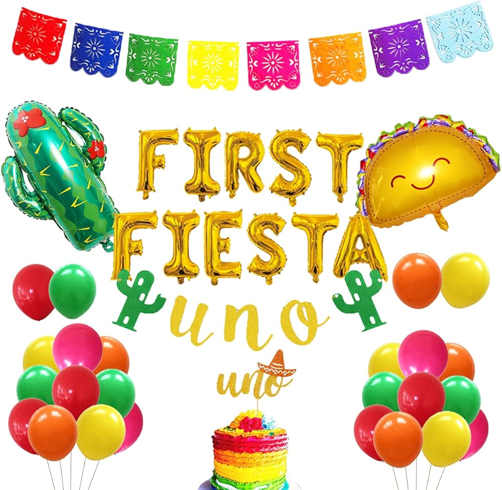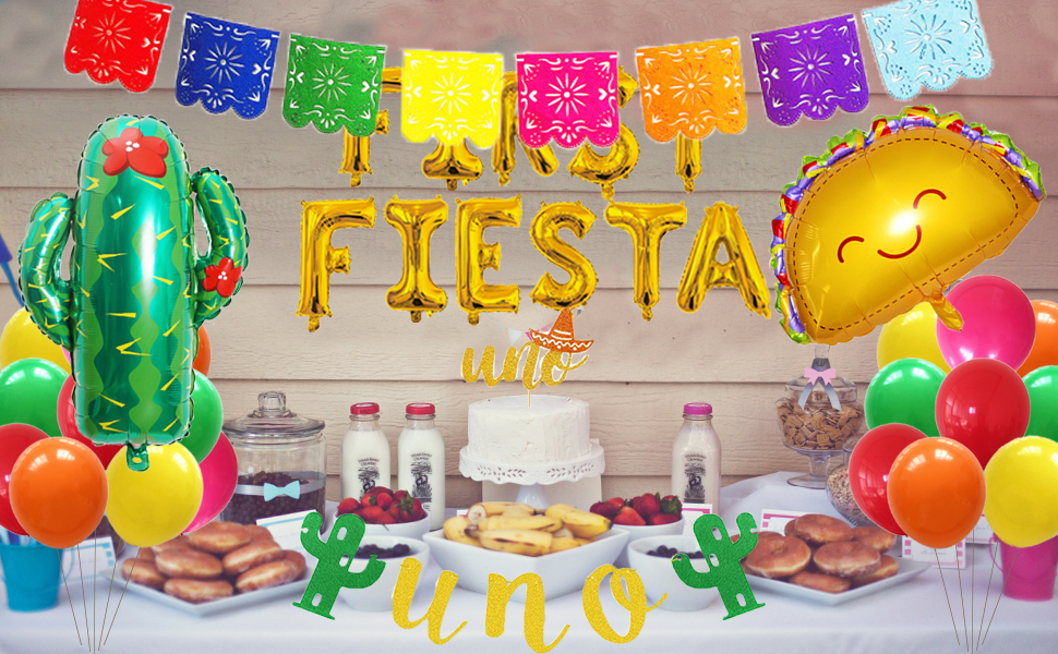 Package Includes :The party pack includes 1 set of FIRST FIESTA balloons(16 inches), 1 cactus foil balloon(28.3*18.1inches), 1 taco foil balloon(28.3*23.6 inches), 25 balloon(5 green , 5 red , 5 yellow , 5 rose red and 5 orange ).1 Mexicano picado banner 1 UNO cactus banner, 1 gold UNO cake topper to create a gorgeous and vibrant party