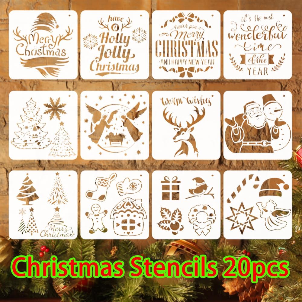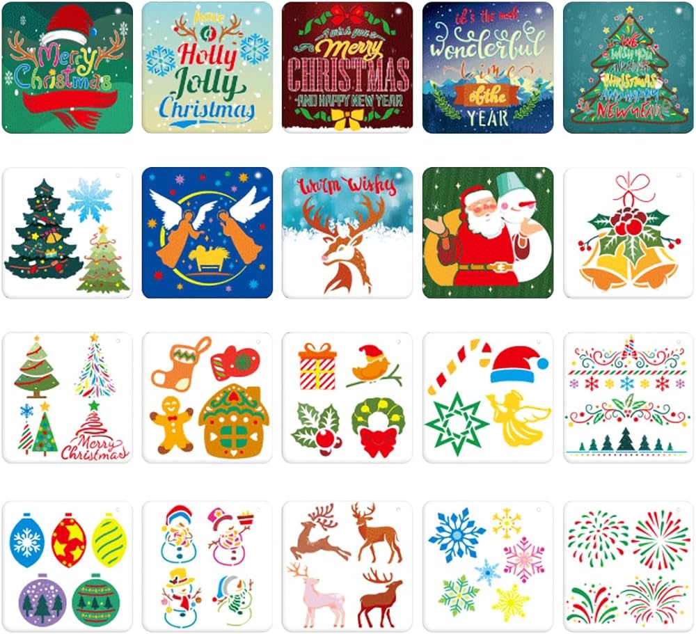 Christmas Stencils Reusable 20pcs Stencils for Crafts Reusable Xmas Templates(5.1 * 5.1inch) for Painting on Wood Slices Holiday Cards Scrapbooks Ornaments Canvas Windows DIY Art