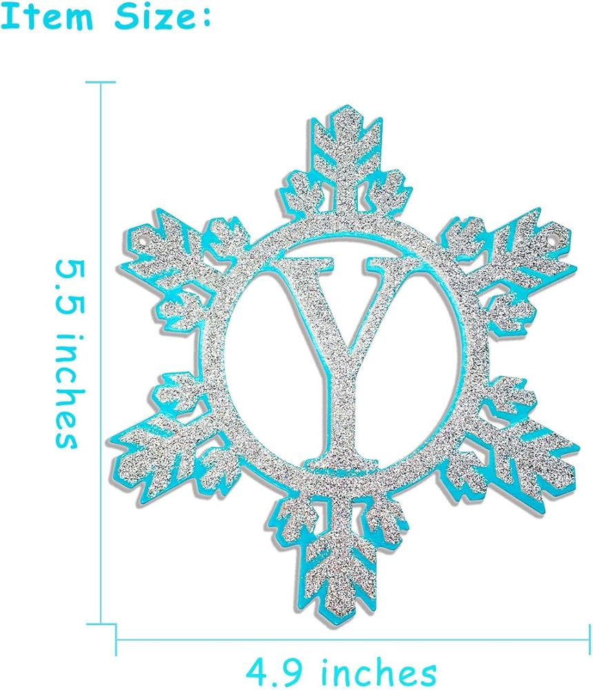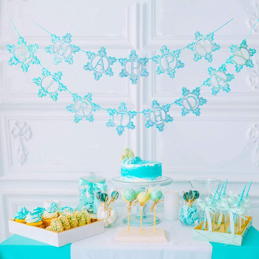 PREMIUM BIRTHDAY PARTY SUPPLIES: Glittering Snowflake Happy Birthday Banners are professionally printed on sturdy cardstock paper. Each card is individually inspected then carefully packaged by hand. Each set comes with two pre-assembled Snowflake Birthday Banners and string for hanging, and the card is at the size of Height 5.5 inches × Width 4.9 inches, the length of the ribbon is about 6.6ft. You can adjust the position of every card.
