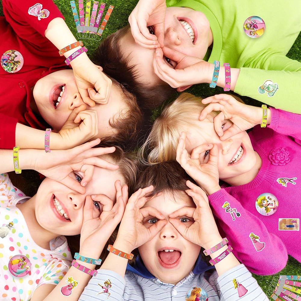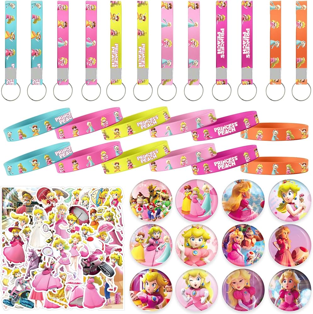 [Products Include]: New Princess Peach themed party favors, 12 bracelets, 12 button pins, 12 key chains, 50 stickers