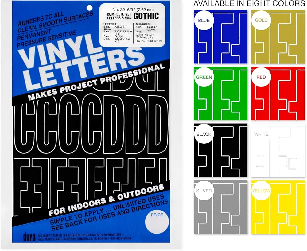Duro-Vinyl Letters & Numbers: 3in Gothic. These vinyl letters and numbers are great for all clean and smooth surfaces where you want permanent lettering: glass, metal, plastic and fiberglass which makes them perfect for mailboxes, windows, boats, campers, vehicles, posters, signs, lockers, wagons, bumpers and much more at home, school and the office. This package contains 160 pieces: ten Is, five A, E, O, S and T, four each: B, C, D, F, L, N, P, R, Y, 1, 2, 3, 4, 5, 6, 7, 8 AND 0, three each: G, H, M and 9, two each: J, K, Q, U, V, W, X and Z and twenty-five symbols. Available in a variety of colors: each sold separately. Made in USA. WARNING: This product can expose you to Lead, a chemical known to the State of California to cause cancer, birth defects or other reproductive harm. For more information go to www.P65Warnings.ca.gov.