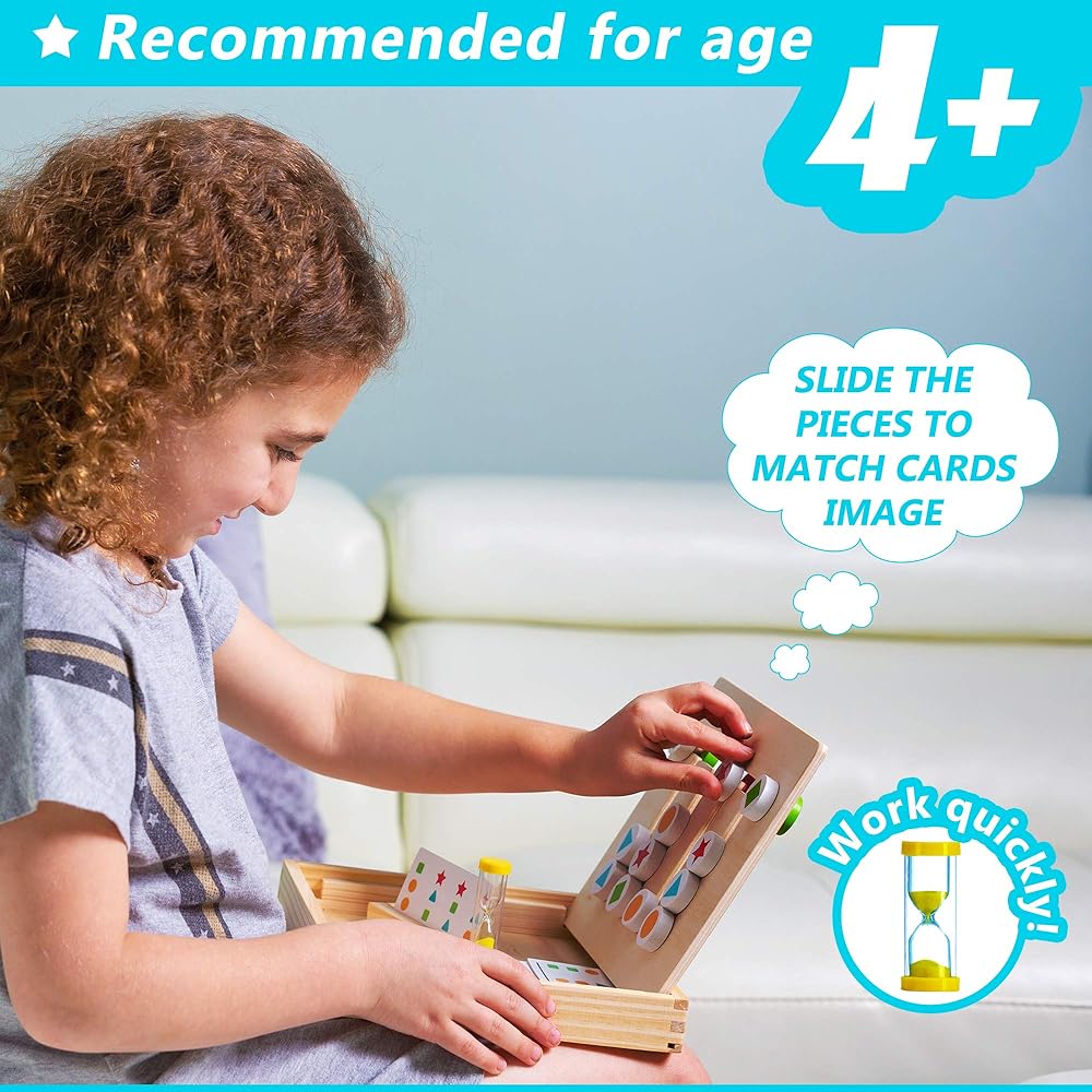 STIMULATE KIDS' BRAINS - The Game works by randomly picking a card in the stack of 18 Double-Sided Puzzle Cards. Slide the blocks in the game board maze to copy the pattern in the chosen card. Set a timer using the hourglass to add more thrill.
