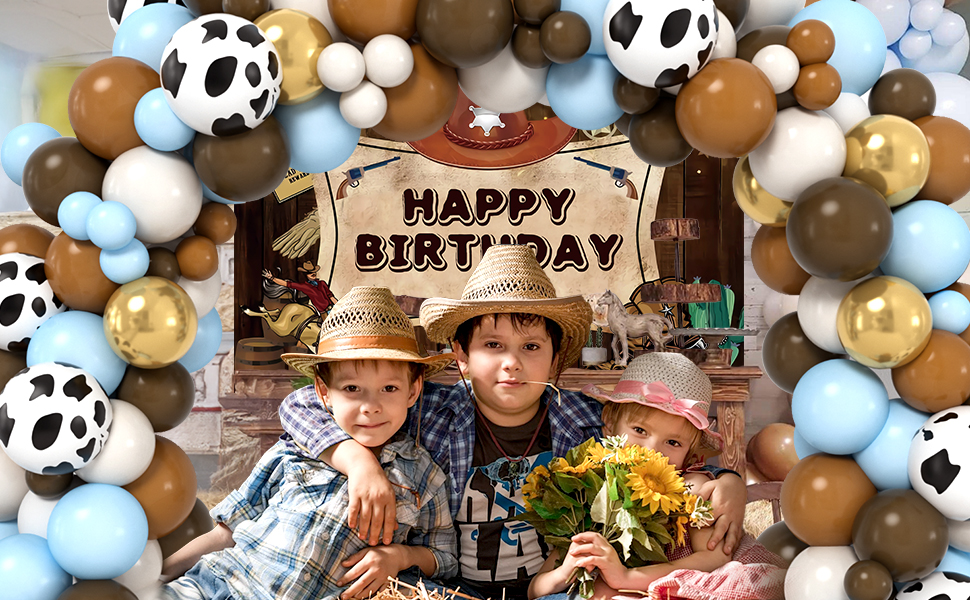 🐄WESTERN COWBOY THEME DESIGN - Get ready for the playful wild west world! We specially designed the blue and brown balloon arch kit and the cow print balloons to create a fun and playful atmosphere! The bright point is the tablecloth and backdrop designed with retro style western elements, instantly transform it into a western wonderland and bring visual enjoyment to you and your guests!