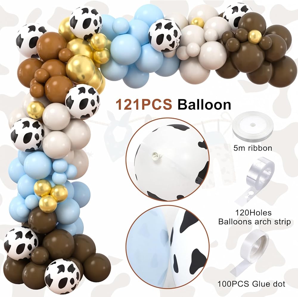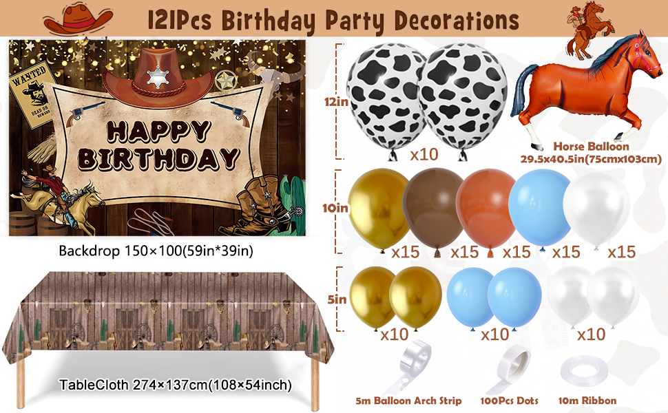 🐄PERFECT COWBOY PARTY DECORATIONS KIT - Give your party a touch of the wild west with our comprehensive cowboy party decorations set. Our western balloon arch kit includes 1 vibrant western backdrop, 1 tablecloth designed with rustic western barn door elements, 1 brown horse foil balloon, 115 latex balloons (5"+10"+12", 5 colors, 10 cow print balloons) with 3 tools.
