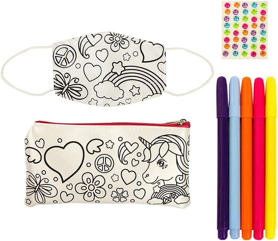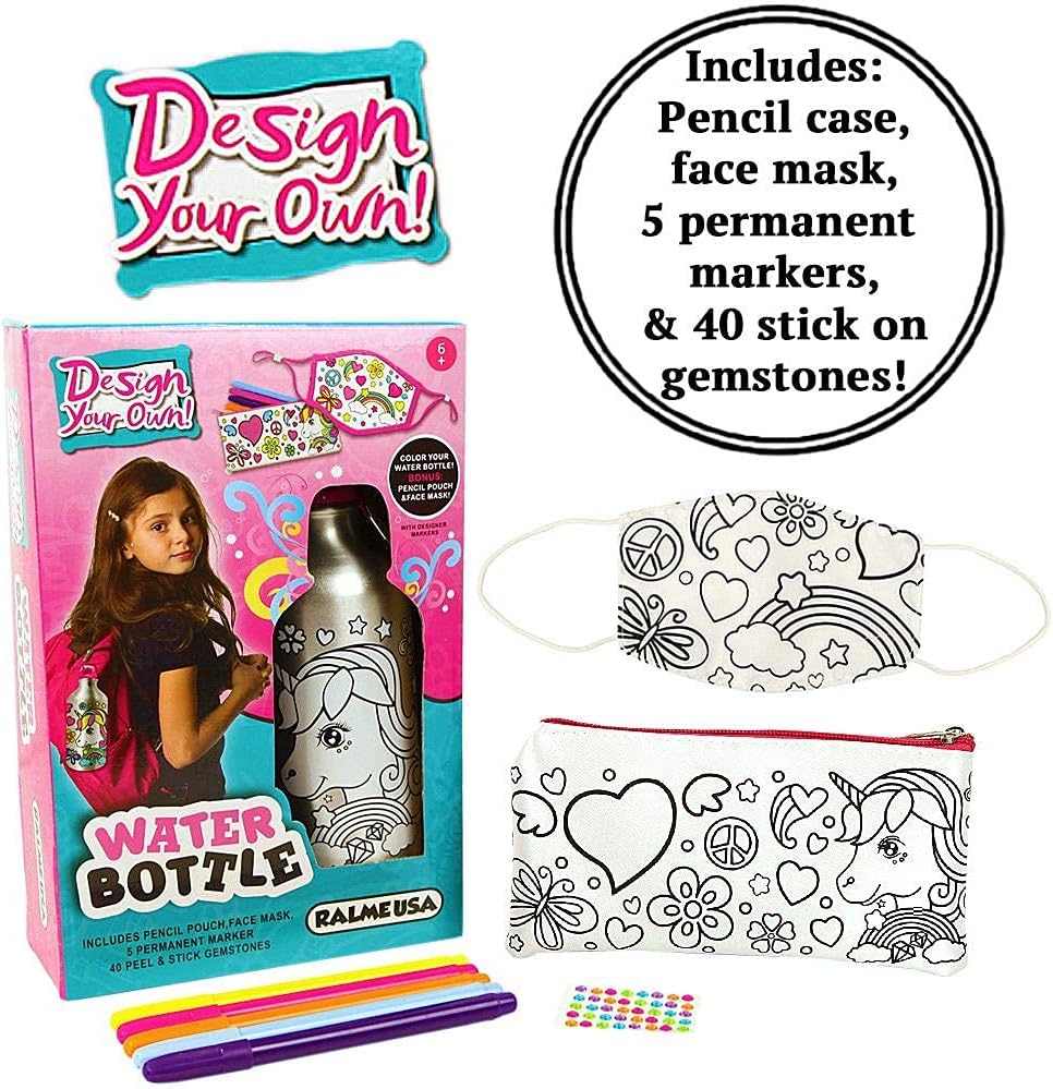 Kids can design their own water bottle with the included markers and rainbow adhesive gemstones in this fun girls' craft set. The bottle with twist-off top is pre-printed with color-in graphics of a unicorn, a rainbow, and all of her favorite things. This complete set comes with a BPA free water bottle that clips onto backpacks, 5 permanent markers, 40 peel & stick gemstones, a ready-to-color kids' size face mask, and a matching ready-to-color pencil pouch with zip top. Encourage kids to stay protected by designing their own mask to wear to school and on outings! The print on the mask matches the water bottle and the pencil case, and they all can be customized to reflect her individuality. The satiny pencil case has a pink zipper top and holds the included markers. It's ready to color with her own design. Makes a great birthday, Christmas, or holiday gift for kids who love arts and crafts. Best of all, she'll be making items she can actually use on a daily basis!