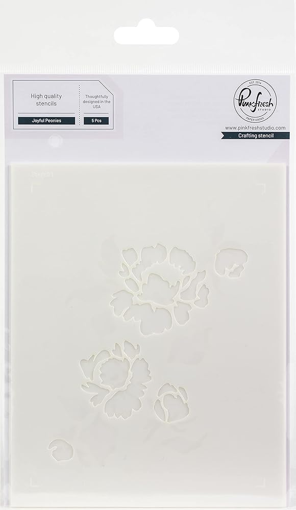 5 piece layering stencil set made to coordinate with the Joyful Peonies cling stamp and Joyful Peonies hot foil plate. Use them without the stamped or foiled image for a soft, ink blended floral bloom image. Use the cling stamp or hot foil plate to add more detail to the image by stamping in detail black, or foiling in gold. Joyful Peonies stencils measure approximately 4.25 x 5.5 inches.