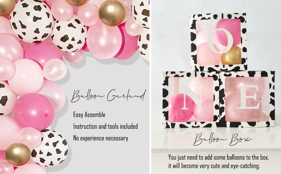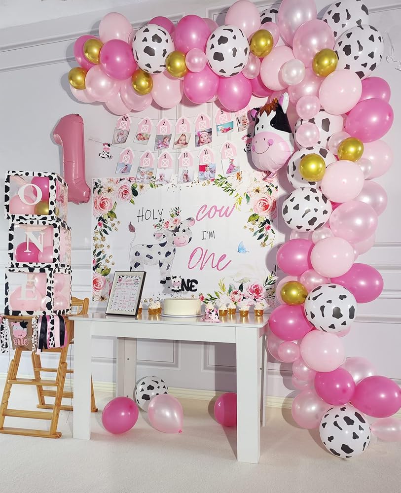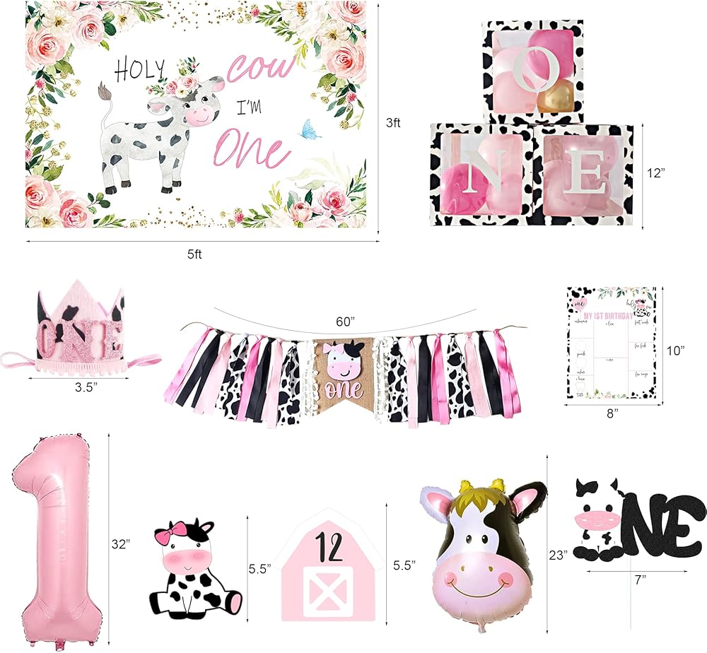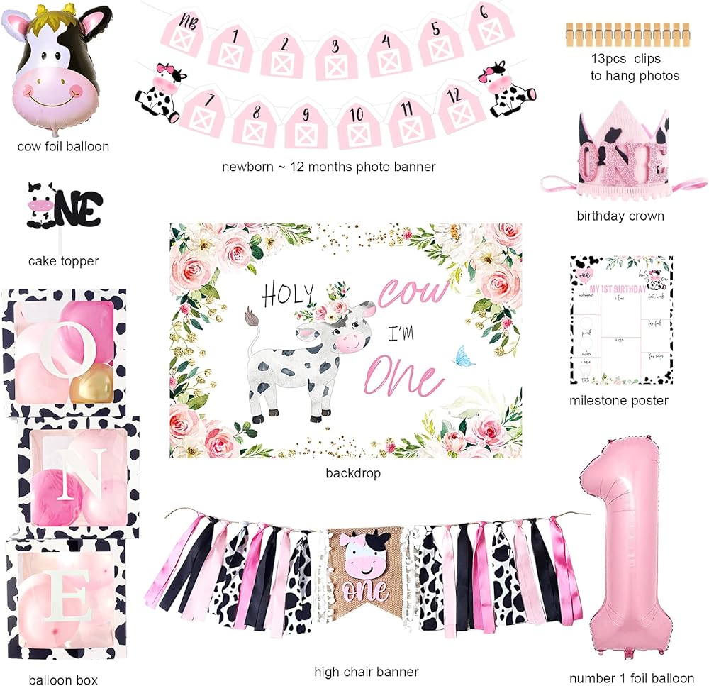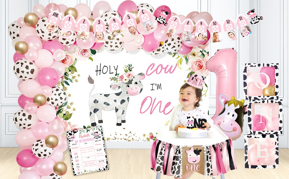 Cow 1st Birthday Party Decorations - Package includes: Holy Cow I'M One backdrop, 3pcs cow balloon box, one cake topper, cow 12 month photo banner, cow 1st birthday high chair banner, cow first birthday crown, pink one foil balloon, cow foil balloon, 1st birthday milestone poster, 99pcs cow balloon garland set.