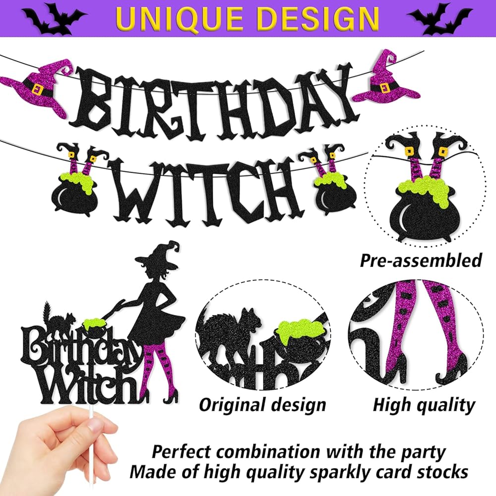 🔮👻HIGH QUALITY MATERIAL💀🎃Birthday witch cake decorations and birthday witch banner are made of high quality black glitter cardstock, the glitter won't fall off. Cute Halloween birthday witch cake topper and birthday witch banner are ready to decorate the special Halloween theme birthday party!