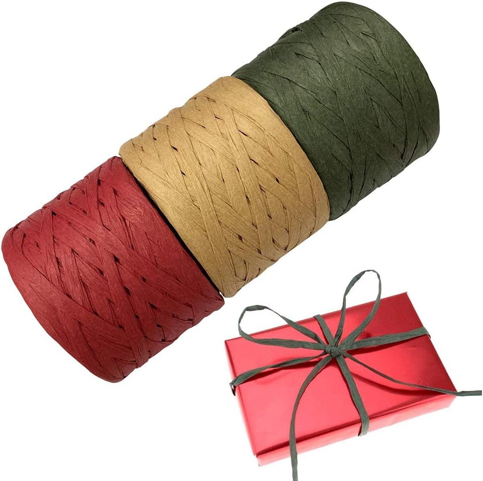Vancool Raffia Ribbon String, 3 Rolls 492 Feet Red Green Kraft , Packing Paper Twine for Christmas, 164 Feet Each Roll