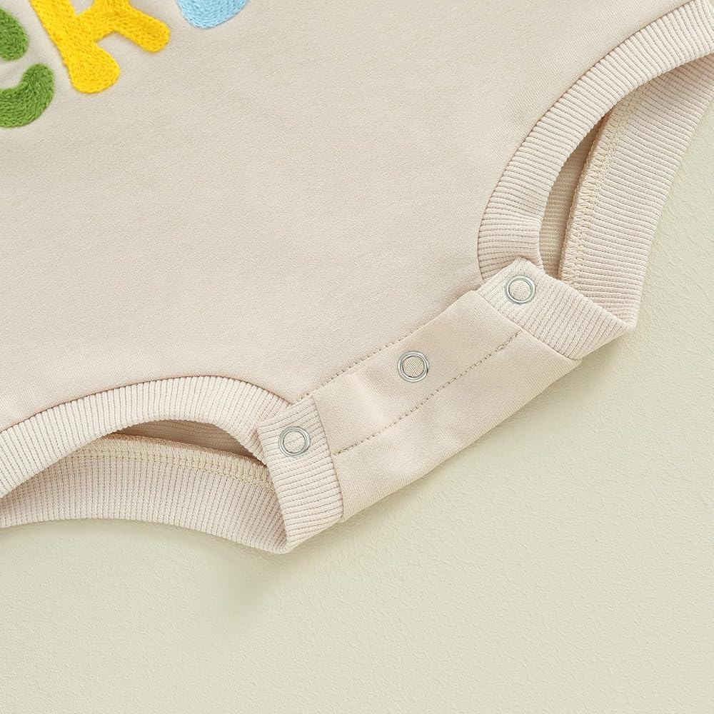 Design: Baby sweatshirt romper with colorful letter embroidery, long sleeves and round neck, bottom button closure, unisex design, cute and comfortable, your little one will receive many compliments wearing it.