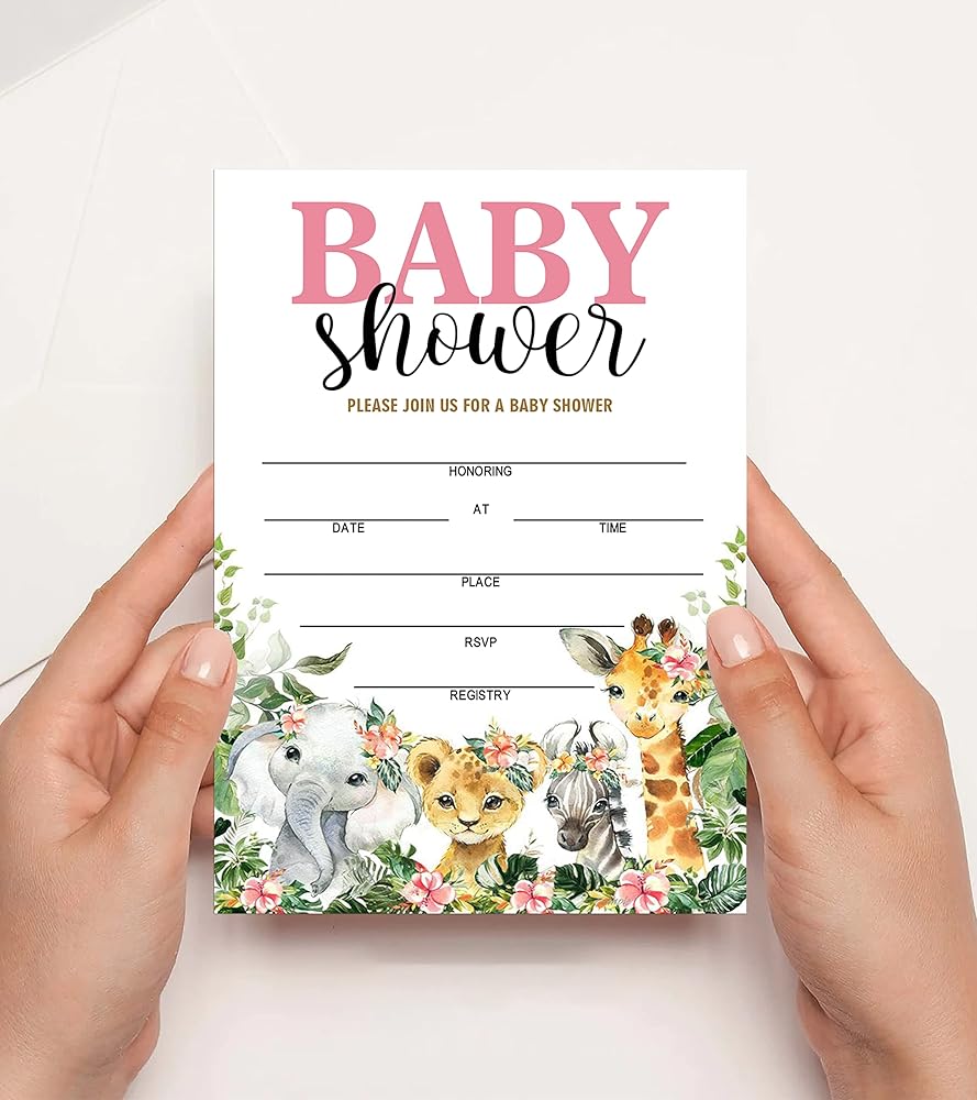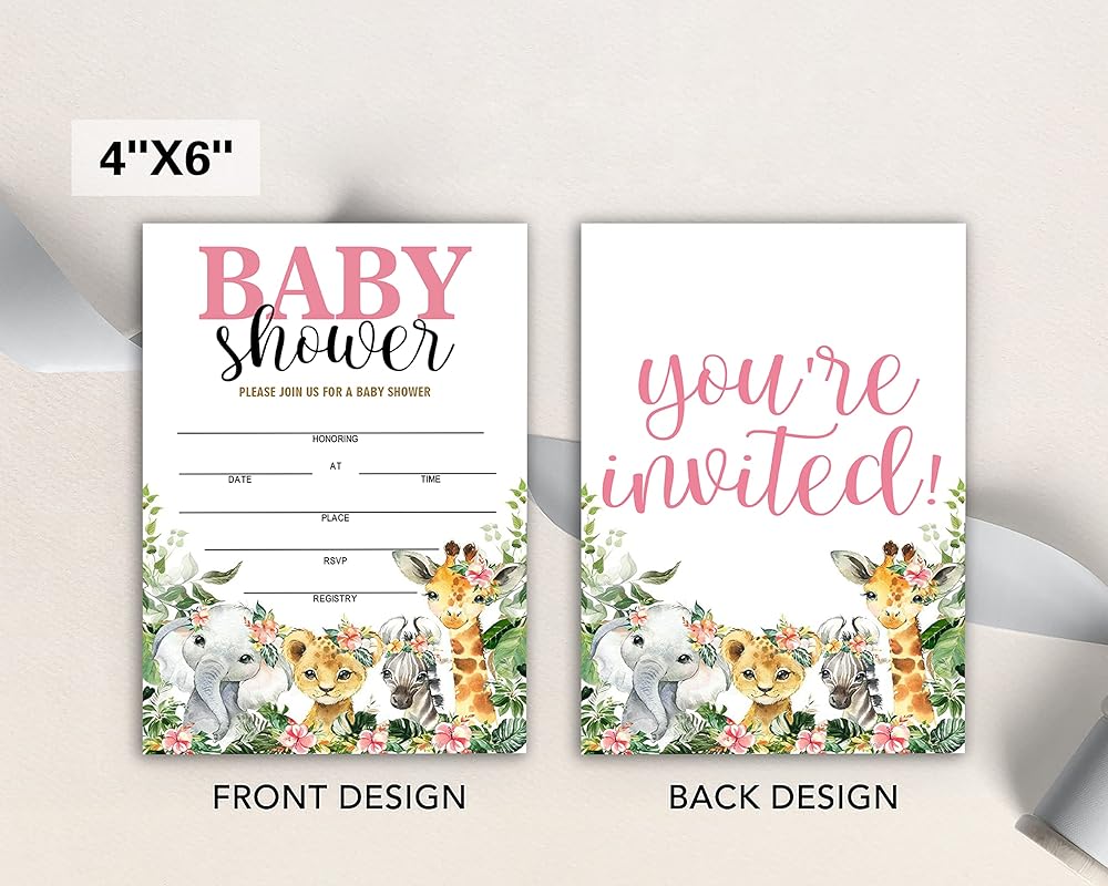 Baby Shower Invitations Gender Neutral with Envelopes, Safari Greenery Baby Shower Fill In Invites Cards, Jungle Animal, Set of 25. lI003