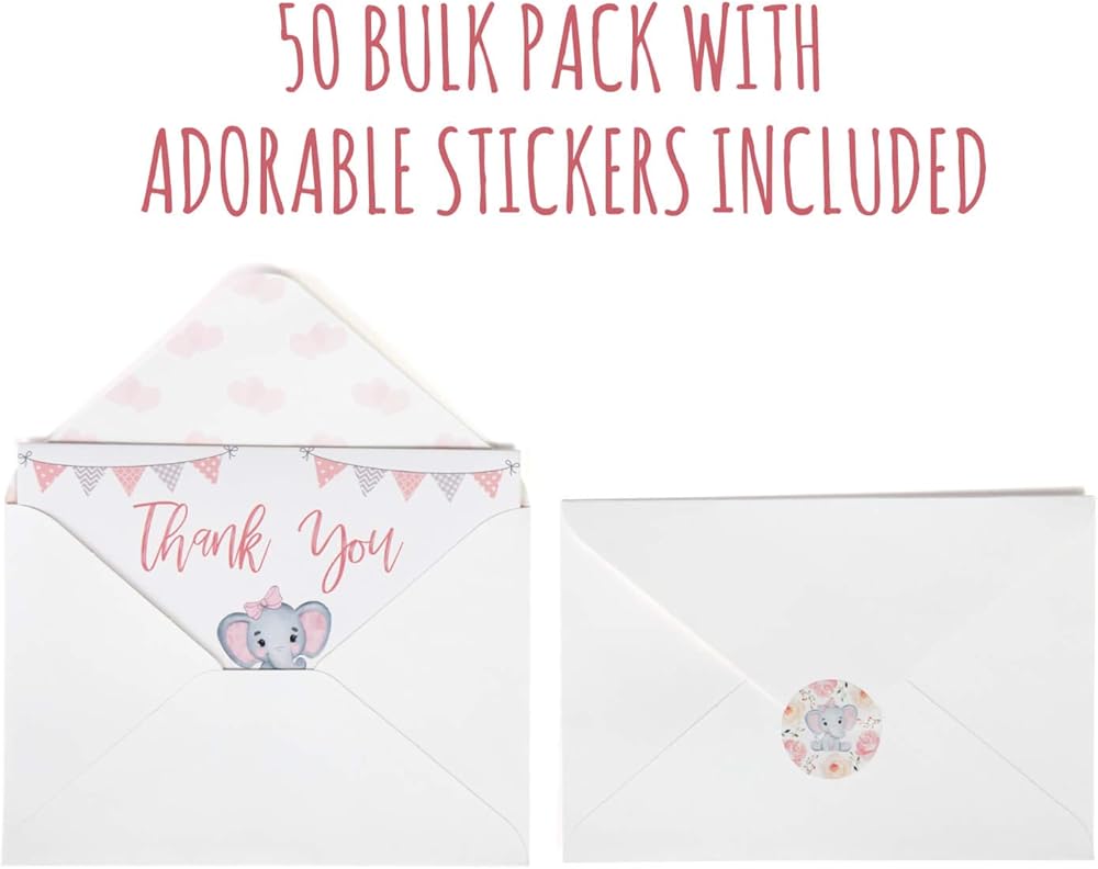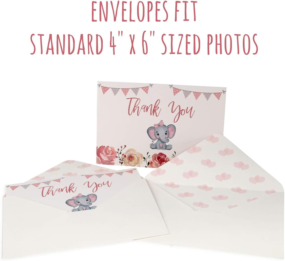 Matching stickers & envelopes: Each pack of 50 baby shower thank you cards includes accompanying envelopes for each card with a white exterior and cute pink watercolor hearts lining the interior to match the baby shower theme.