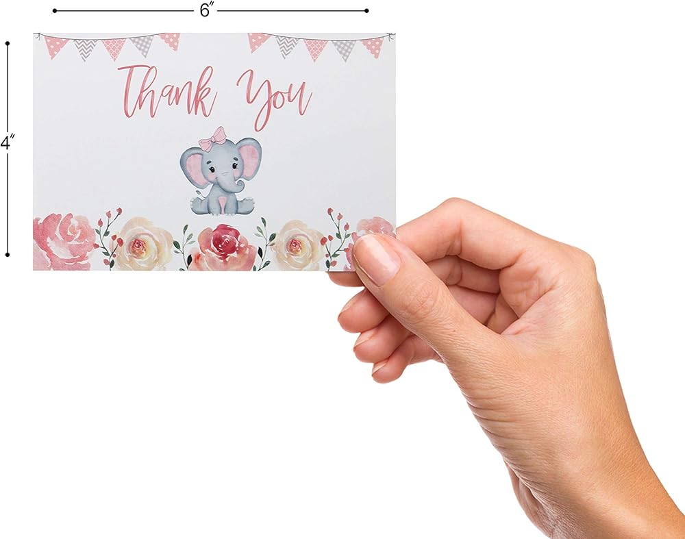Cute Elephant theme: Each foldable baby shower card shows an adorable hand-designed baby girl elephant with a bow tie and a whimsical “thank you” above her head; The yellow themed design will be the perfect match for a thank-you from your baby!