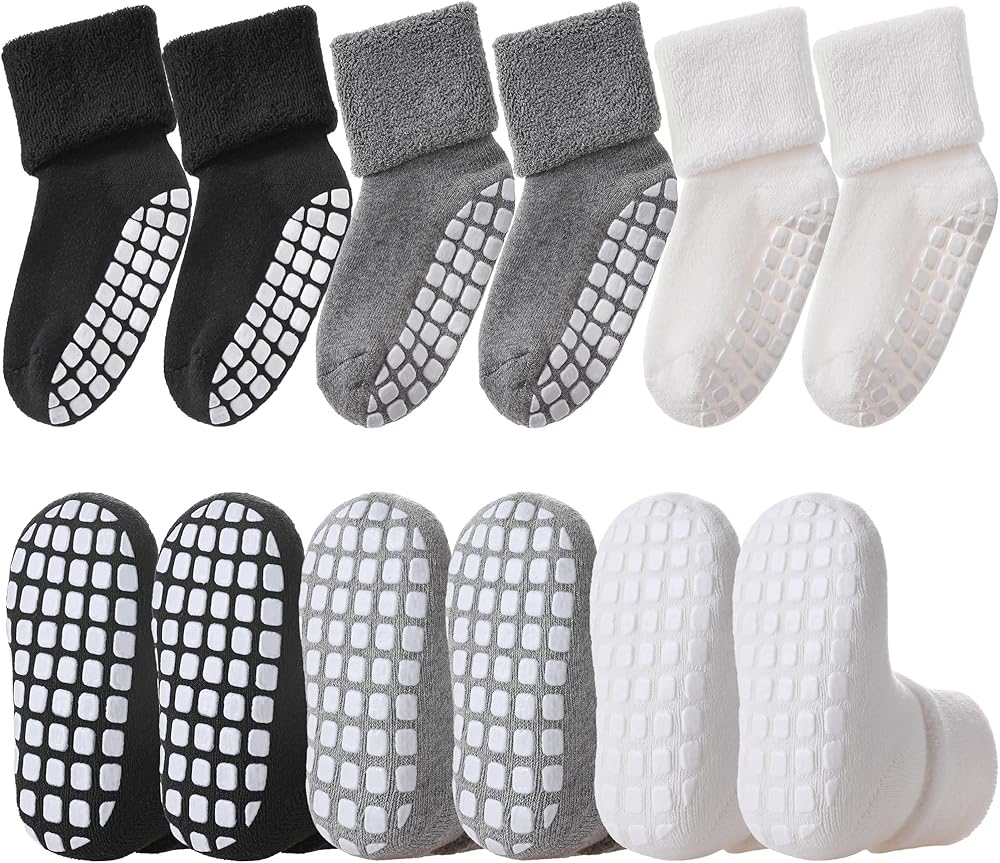 SUPER SOFT TOWELING LINING COTTON SOCKS--87% combed cotton, 10% polyester, 3% spandex. These toddler non slip socks are made of high quality skin friendly Cotton, soft terry cover the entire sock, ultra soft and comfortable to wear, breathe freely, absorb sweat, these toddler grip socks will keep little toes warm for baby.