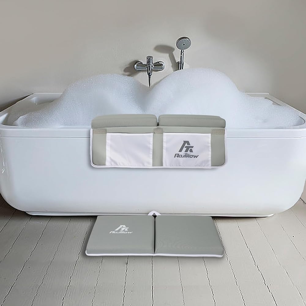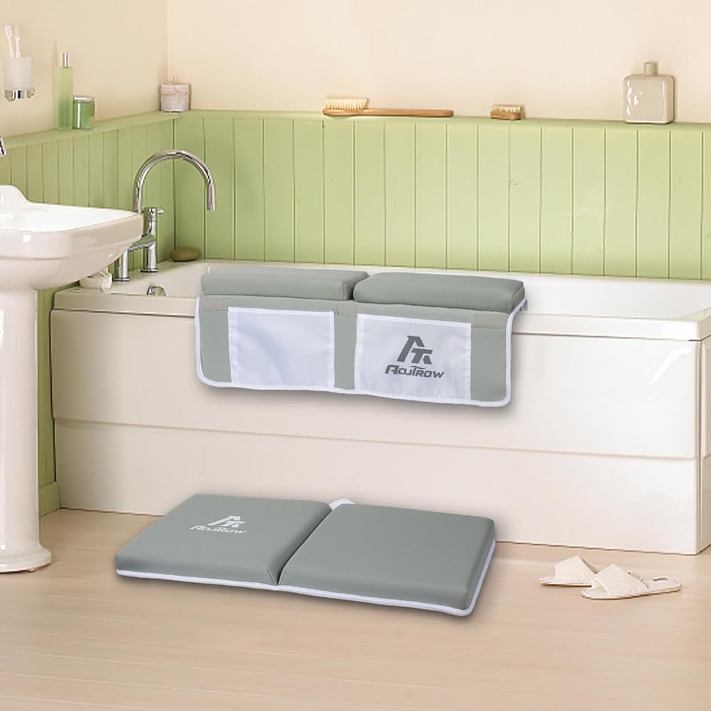 Aoutrow 2 PACK Comfortable Baby Bath Kneeler and Elbow Rest Pad, Foam Mat with Toy Organizer Pockets Bath Accessory Storage, Non-Slip Compact Foldable Baby Bath Set for Parents Baby and Toddler Bathin