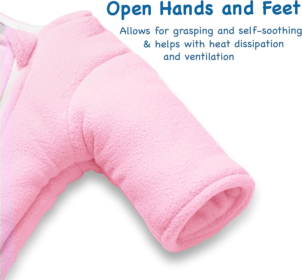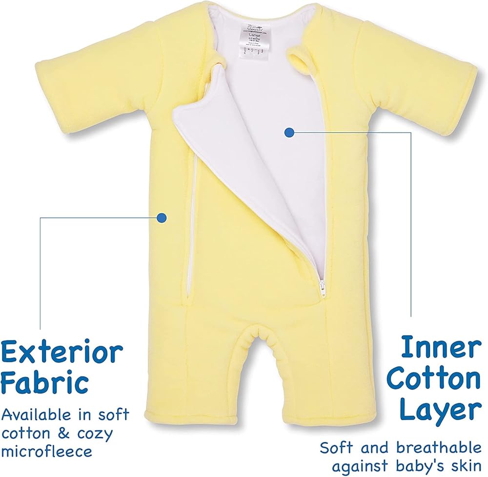 The Magic Sleepsuit is a patented swaddle transition product that helps transition babies from the swaddle by providing them with a cozy, secure feeling. The Magic Sleepsuit was created by a mother of four who is a pediatric physical therapist to improve the quality and duration of her babies' sleep. The Magic Sleepsuit is designed for back sleeping in the bare crib only in a room at the recommended temperature for babies. The Magic Sleepsuit should not be used for co-sleeping, or with any sleep positioners. The Microfleece Magic Sleepsuit has a soft, breathable jersey cotton inner layer, a soft microfleece outer layer and a layer of polyfil in between for just enough comfort. The Magic Sleepsuit is designed to be introduced at approximately three months of age when babies are transitioning from the swaddle. Babies should be transitioned out of the Magic Sleepsuit when they roll over or try to roll over in it and are ready for more freedom of movement in their sleep. The Magic Sleepsuit provides your baby with a cozy and calming sleep environment that will become a consistent part of their sleep routine. The Magic Sleepsuit is designed to aid in baby's sleep patterns, and give parents peace of mind that their baby is getting adequate rest necessary for appropriate growth and development.