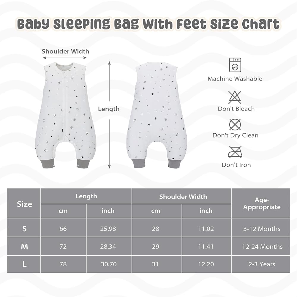 EASY CARE - Machine wash, Tumble dry at low temperatures(<30°C). The baby sleep sack with feet is vacuum-packed, and there may be many wrinkles after opening. We recommend that it can be left for 48 hours or washed according to the washing method, and it will be the best.