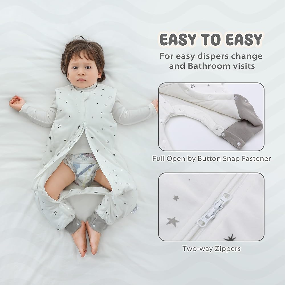 SNAPS DESIGN AND SMOOTH 2-WAY ZIPPER - Our toddler sleeping sack is designed with crotch snaps on the bottom that can be fully opened , and with smooth 2-way zipper style. Unzips from the Top, which makes it easy to place baby in sleepsack, makes it convenient for diaper changing. Zipper protectors on the top and on the crotch will protect baby's skin from scratches. The spacious leg area is suitable for the baby's natural frog leg posture, which is conducive to the baby's hip development.