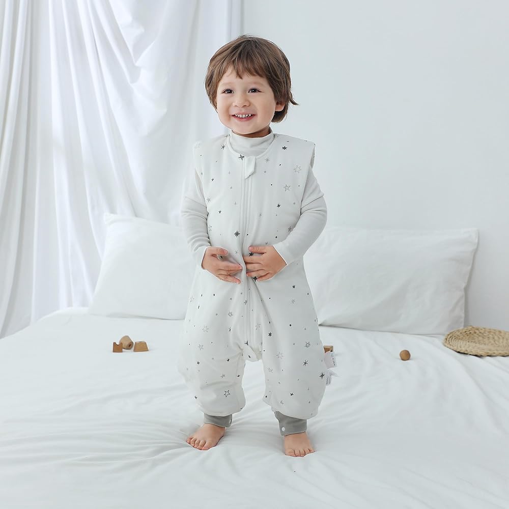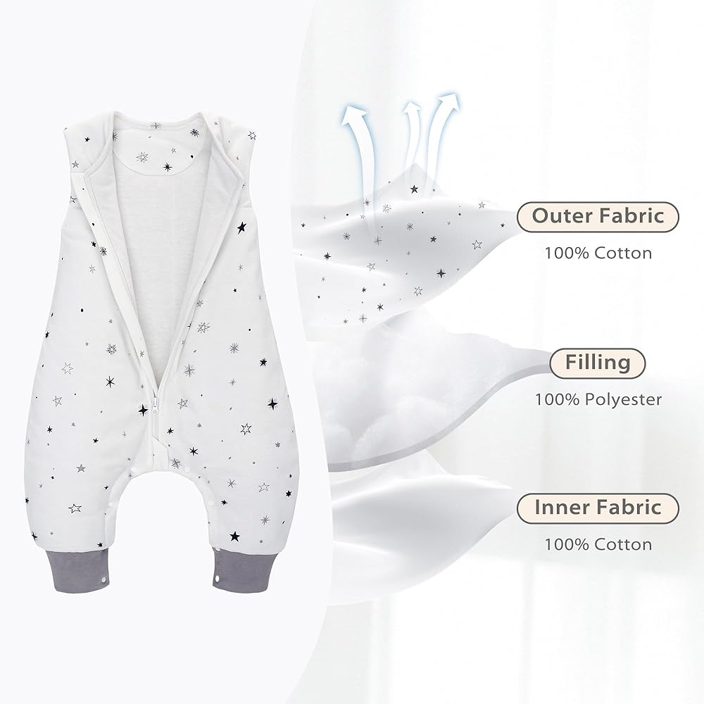 ULTRA SOFT AND EXTRA WARM SLEEP SACK - Made of 100% cotton with a TOG rating of 2.5, our sleep sack with legs is soft, cozy and warm to wear for room temperatures 16-20°C. The filling is made of ultra-light and ultra-warm polyester fiber. It is warm and secure baby throughout the night.