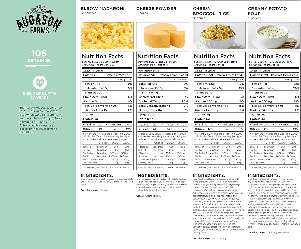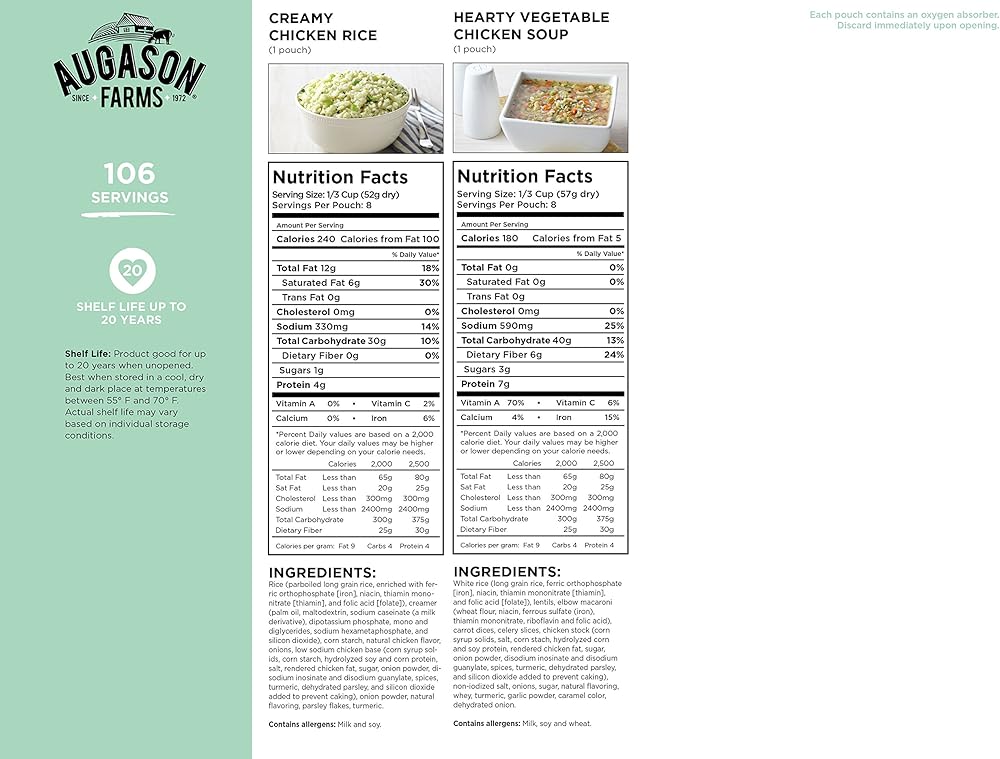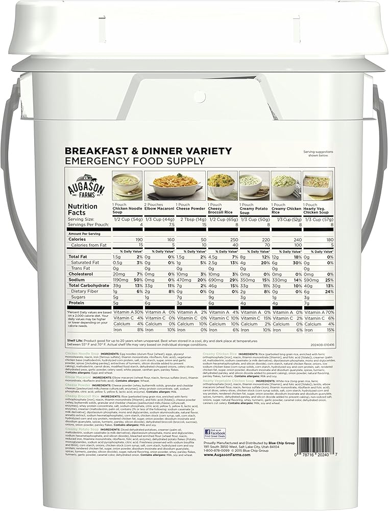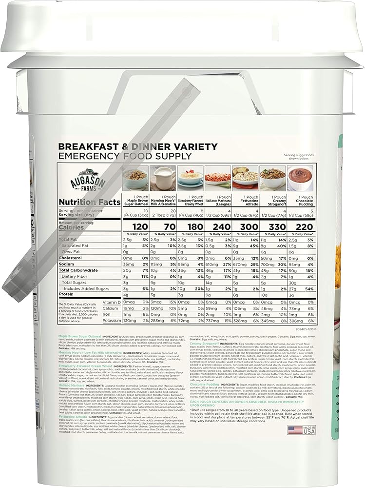 Perfect during times of unexpected catastrophes or busy weekdays, Aguayo Farms breakfast and dinner variety pail is an emergency food supply that provides a delicious variety of healthy, ready-in-minutes meal options. Shelf life ranges from 10 to 25 years based on product type and storage conditions.
