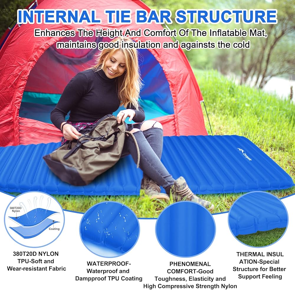 Durable and Wear Well: Made from high-quality 380T20D nylon materials, this sleeping pad‘s surface is tough enough to withstand the elements and resist punctures and tears. TPU coating resists water and air leaks, so you can use it for all your outdoor adventures. It's also easy to clean, you can keep it looking like new for years to come. Whether you're camping in the rain or sleeping under the stars, you can count on our sleeping pad for camping to provide reliable comfort and support