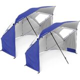 The 8 foot Super Brella provides easy, maximum protection to keep you sheltered from the sun, wind, and rainch It provides side flaps for full shelter protection, zippered windows for extra airflow, and internal pockets to store stakes or other valuables. It is lined with a UPF 50+ undercoating that blocks over 99.5 percent of the harmful UVA and UVB rays. The Super Brella is a simplified version of the Sport Brella and is still great for camping, sporting events, and the beach.