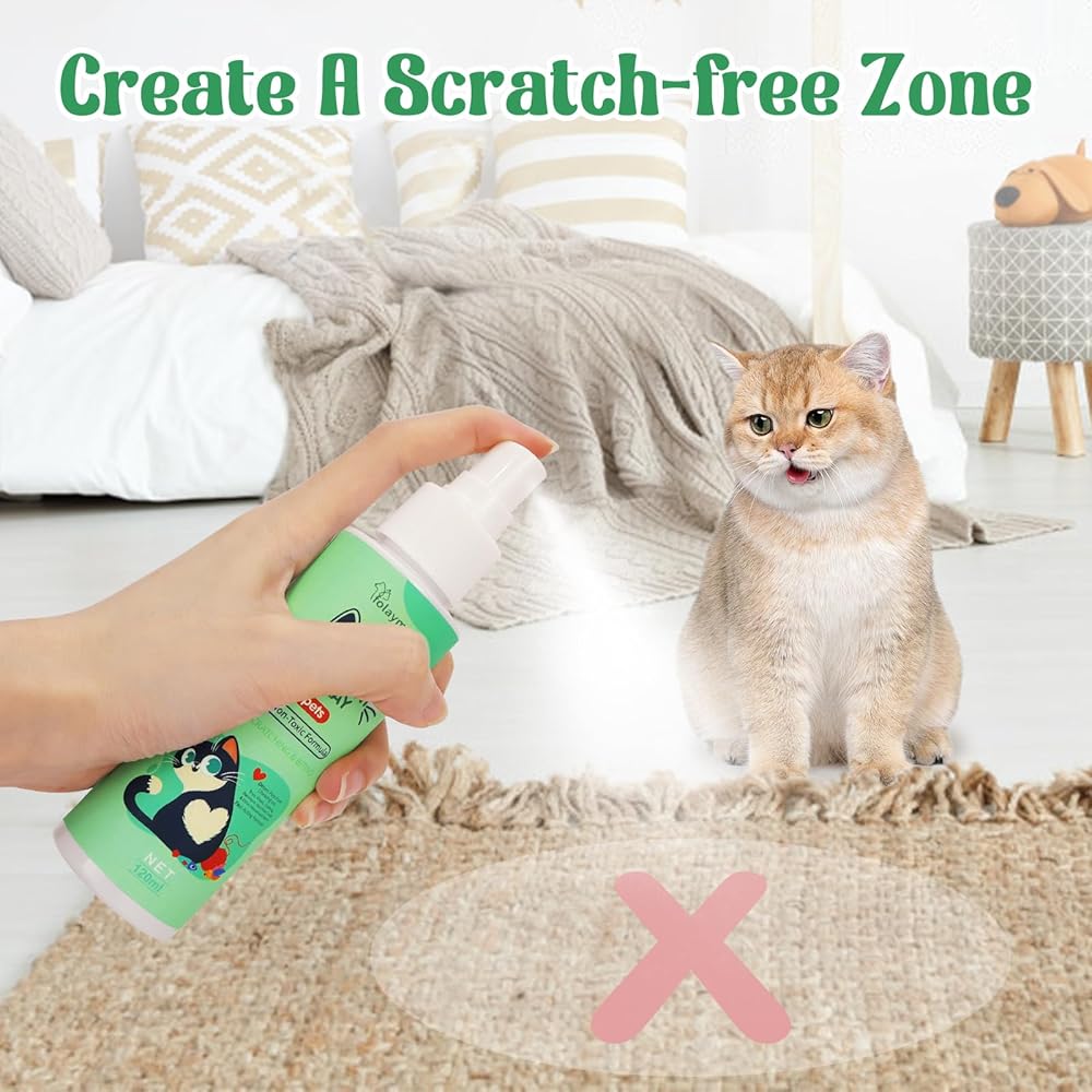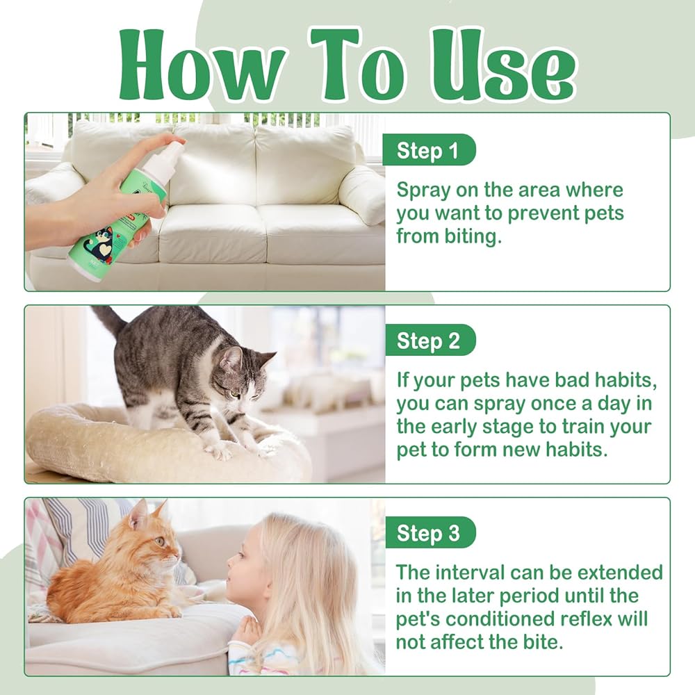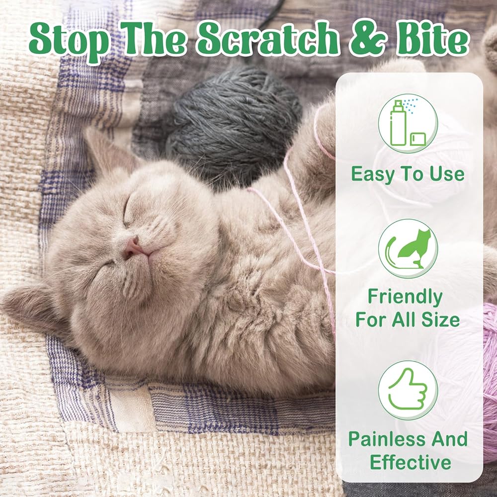 Stop Cats From Scratching & Chewing Our all natural bitter spray for cat deterrent is the anti-scratch furniture protector. Made with added bitters, it stop cats from scratching and chewing. Simply spray on target areas, you can prevent cats from chewing and scratching. Tips: Natural bitters may cause allergic reactions in humans and animals. Test for adverse effects for first using. Suitable For Various Areas Our spray can be applied to wood, fabrics and more. It is a nice choice for Christmas tree protector from cats. Can be used directly on your cats' hot spots, fur, bandages, plants, furniture, drapes and so on. Warm Tips: Before first use, spray a small amount in an inconspicuous area to test for color safety.