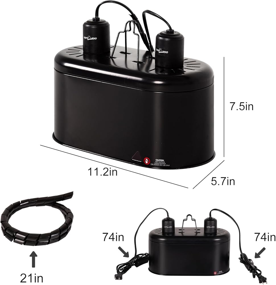【Dual Reptile Light Fixture】The top reserves radiating and ventilating holes to ensure good heat dissipation effect; Two independent switch power lines for easy control separately lamp; The hanging hook easy to hang it with the lamp stand. Each can bear Max 150W.