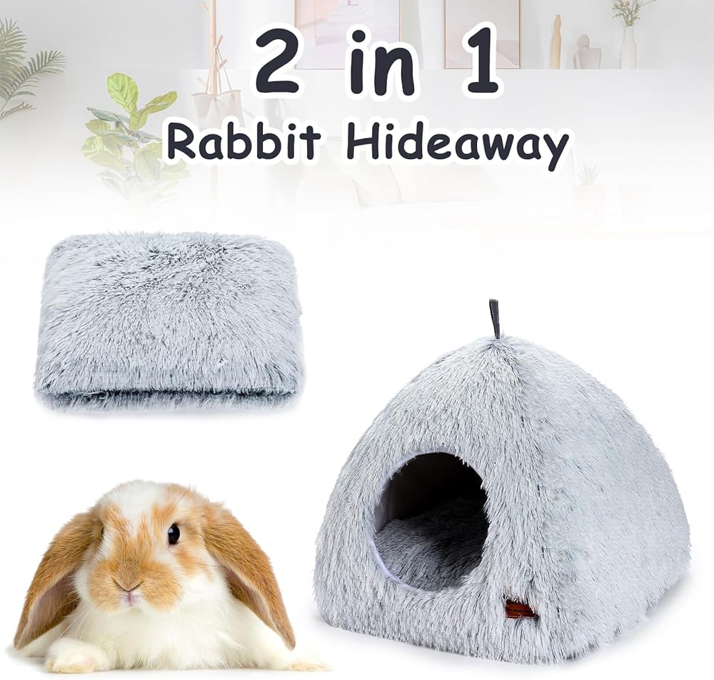 🐇【2-in-1 Design for Added Versatility】- This rabbit hideaway features a unique design with a tree hole-shaped opening, creating a sense of belonging for your pets. The top of the hideout can be pressed down to transform it into a sofa, providing an additional seating option for your small animals. The grey plush design adds warmth and beauty to any pet enclosure