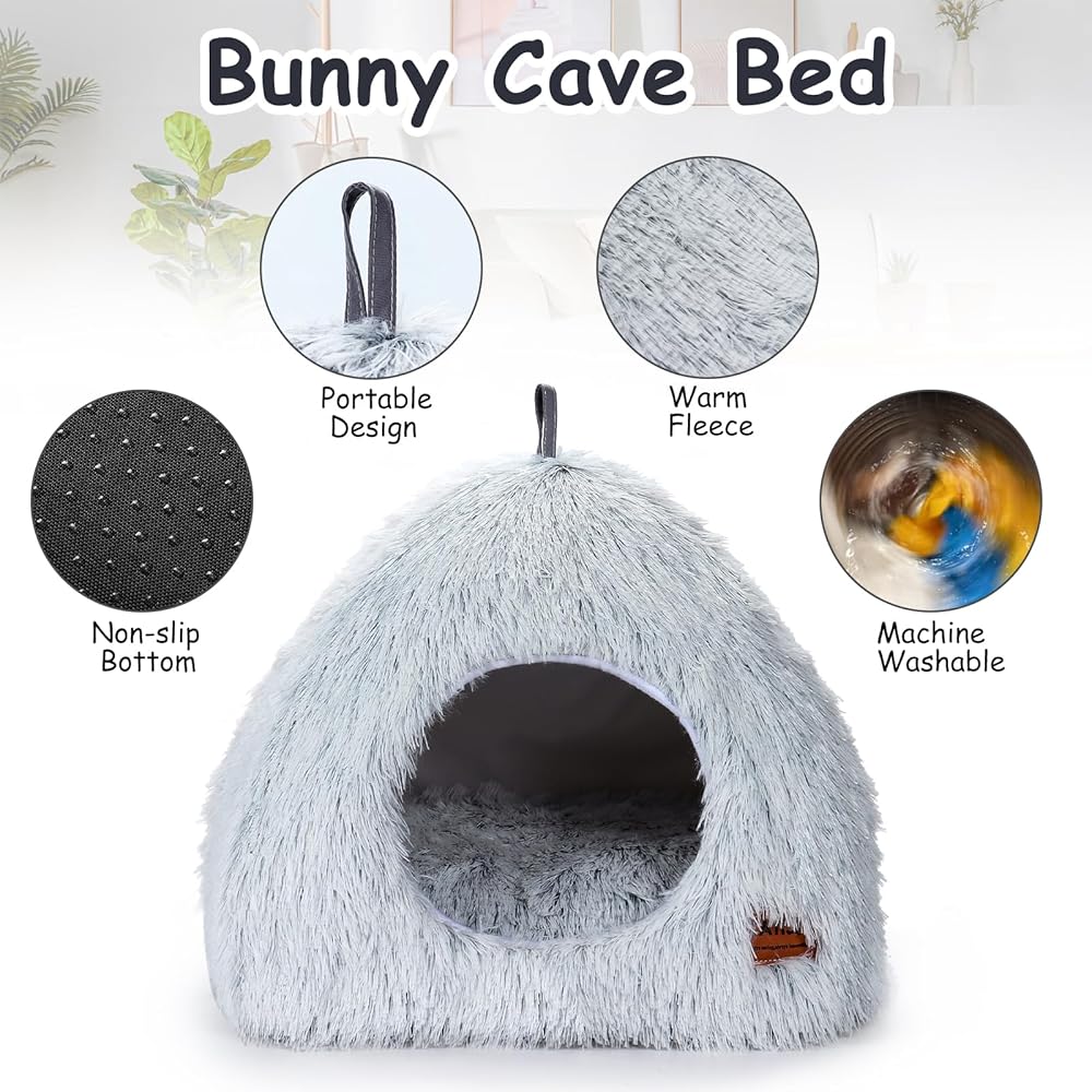 Introducing the PStarDMoon Rabbit Bed Warm Calming Rabbit House and Hideout, Grey Bunny Cave Bed for Rabbits Ferrets Guinea Pigs Hamsters and Other Small Animals. This rabbit hideout is designed to provide a cozy and comfortable resting place for your furry friends.The size of this bunny hideout is 13.8*14.2*14.2 (L*W*H) inches, offering ample space for your pets to relax and unwind. The cave itself measures 6.3*6.7 inches, providing a spacious area for your little ones to nestle in.Not only does this rabbit house serve as a bed, but it also doubles as a sofa. Simply press down on the top to transform it into a comfortable seating area for your pets. The grey plush design adds a touch of warmth and beauty to the overall look.Crafted from high-quality plush material, this warm rabbit house offers a soft and fluffy resting place for your pets. It helps to provide them with a sense of comfort and security, allowing them to rest better. The bottom of the hideout is equipped with non-slip pads to ensure the safety of your pets.Cleaning this rabbit hideout is a breeze. The cave comes with a warm and soft cushion that can be easily separated from the bed. This allows for convenient cleanup of small pet excrement. The hideout can be hand or machine washed, ensuring a hygienic environment for your pets.The bunny cave bed is perfect for providing a relaxing and comfortable space for your pets to play, rest, or hide. It is suitable for rabbits, ferrets, guinea pigs, and other small animals. Give your furry friends the ultimate comfort with the YUEPET Rabbit Bed Warm Calming Rabbit House and Hideout