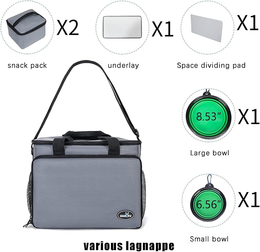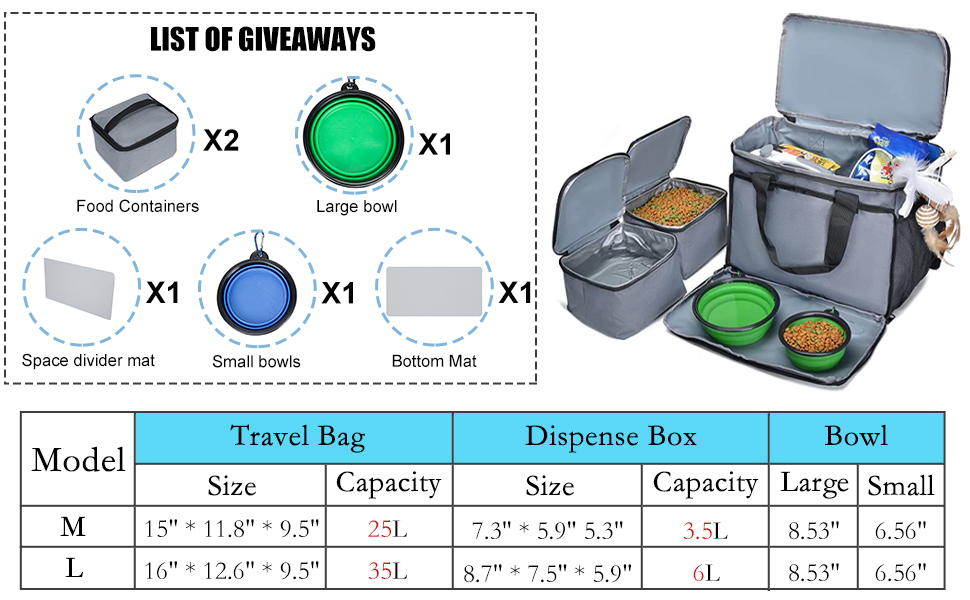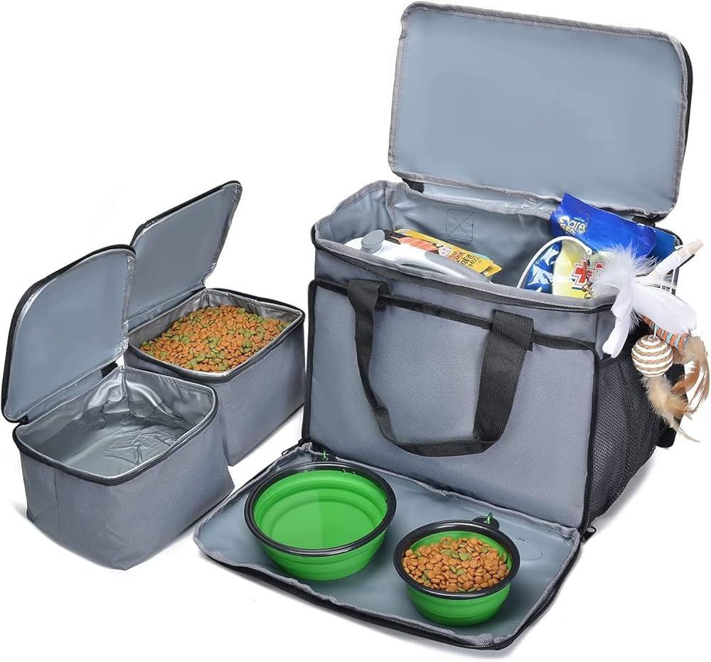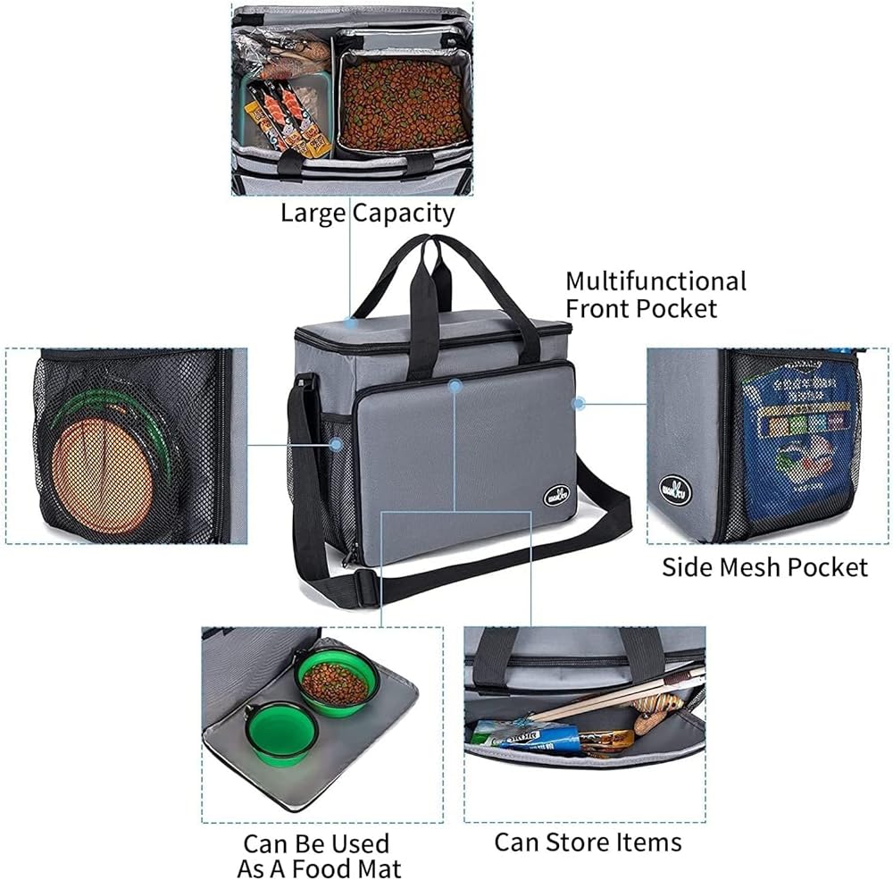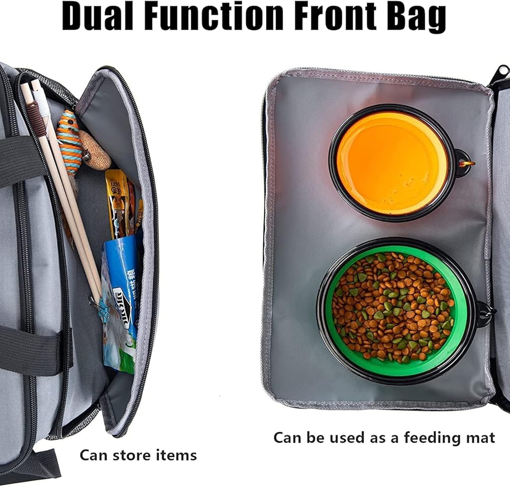 🐕【HIGH QUALITY MATERIALS】: ①2 removable PP internal dividers, which can be freely separated from the internal space or placed at the bottom to strengthen the weight-bearing. ②The pet travel set is made of polyester material, which is tear-resistant, wear-resistant and excellent waterproof, and can accommodate multiple types of food. ③The front pocket can be used as a food pad or put some pet supplies.