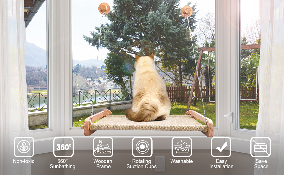 🐈【SAFE & STABLE】CATISM cat window perch provides all-around sunbathing enjoyment for cats, with turn-out air suction cups and tough cables that allow it to hold up to 30 pounds or more for multiple kittens or medium cats.