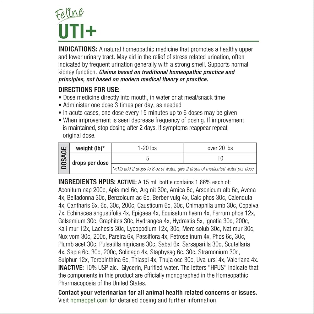 HomeoPet Feline UTI Plus urinary-tract support provides natural help for cats facing urinary issues. This homeopathic medicine may aid in and help support urination problems. This bladder-and-kidney-support medication can be used if your cat is showing UTI symptoms, including burning, spraying, straining, and stress-related urination often indicated by frequent urination, sometimes with a strong smell. Feline UTI Plus is safe and gentle enough for kittens and young, adult, and senior cats.