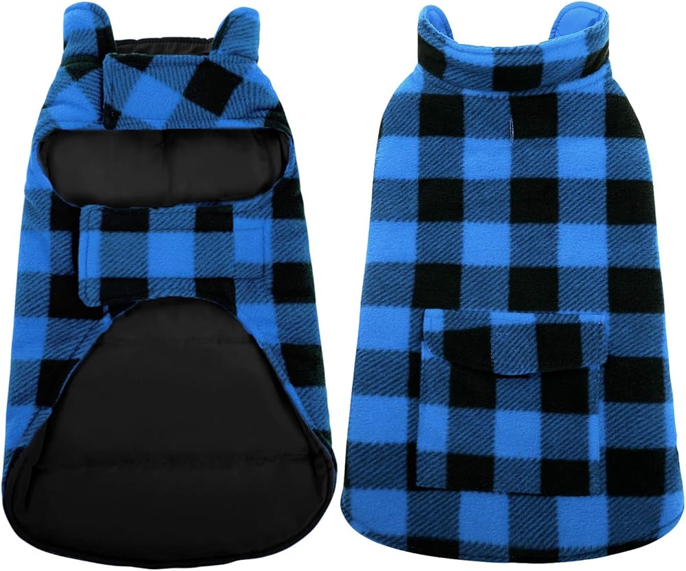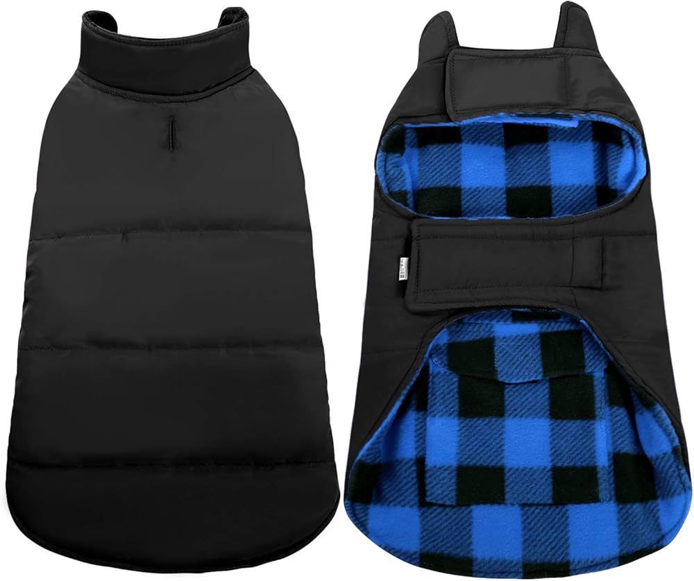 CREATIVE DESIGN: The dog winter jackets can be two-sided worn, with the magic sticker closures around the neck & belly that can easy to adjust the size to fit your dog, also easy to wear and take off. The Plaid fabric side also has a pocket on the back, you can store some small things in it.