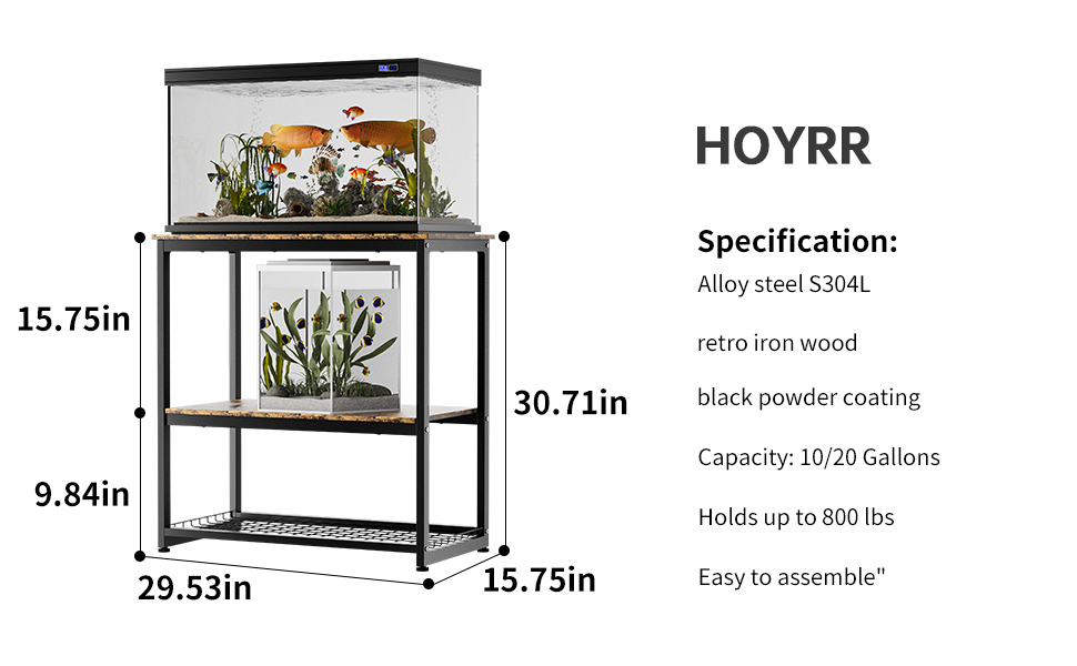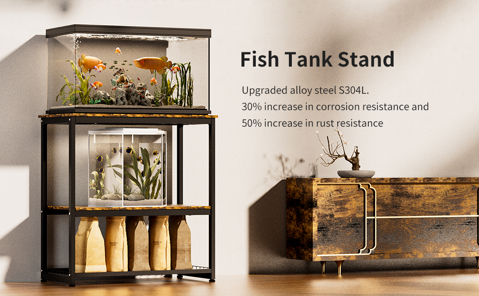 Fish Tank Stand Sturdy Durable:fish tank stand Upgraded and upgraded Alloy steel S304L. 30% increase in corrosion resistance, plus 50% increase in rust resistance with glossy baking paint, fish tank stand is replaced with better materials just to improve the service life and use experience,fish tank stand Combined iron and wood structure design to strengthen the ability to bear weight and improve stabilityIron and wood combination of structura.
