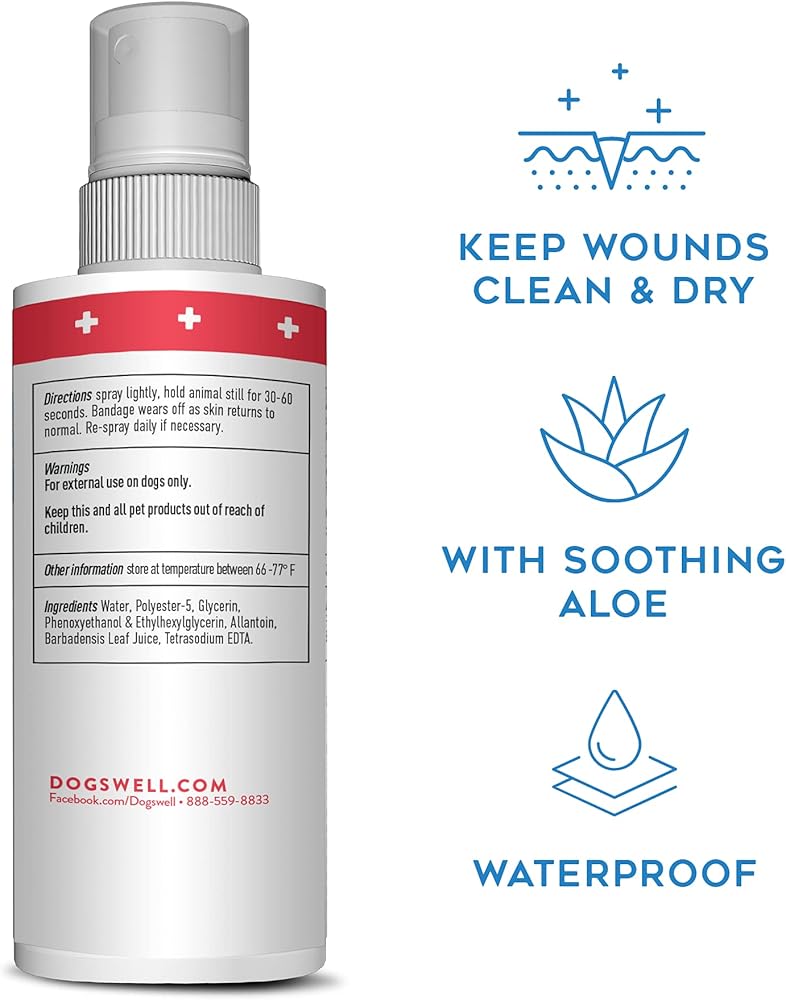 Liquid Bandage is a medical device created to help heal and protect your pet's injury, keeping it clean and dry. Its easy spray application dries quickly and begins to soothe instantly. It contains no alcohol so there is no worry that it will sting or cause your pet discomfort. Soothing aloe and chamomile calm redness and irritation. This polymer-based film is breathable to promote healing and contains no acrylic (plastic).