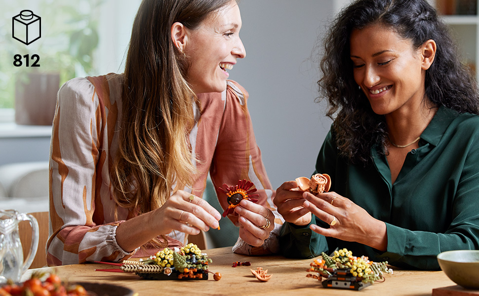 Cultivate a piece of home decor that requires zero maintenance with this LEGO Icons Dried Flower Centerpiece (10314) crafts sets for adults. An immersive building project, the artificial flowers set is bursting with vibrant blooms inspired by the colors of autumn. The LEGO Icons flowers set for adults features rose and gerbera as its focal point. Once it's complete, you can use it as a striking home centerpiece or hang it as flower wall decor to create a floral display to cherish forever. The buildable model has a split design that allows 2 people to construct it at the same time, providing the perfect way to spend quality time with a friend or family member. You can also use the LEGO Builder App to store instructions as well as view, zoom and rotate your creation as you build the real model. Part of the revolutionary LEGO Botanical flower and plant Collection for adults, this buildable model set includes several elements made from plant-based plastic produced using sustainably sourced sugar cane and makes a unique flower gift idea for adults who love arts and crafts activities. This product measures 7 cm (3 in.) high, 40 cm (16 in.) wide and 13 cm (5 in.) deep. Contains 812 Pieces.