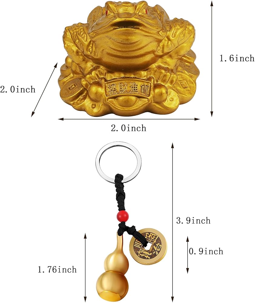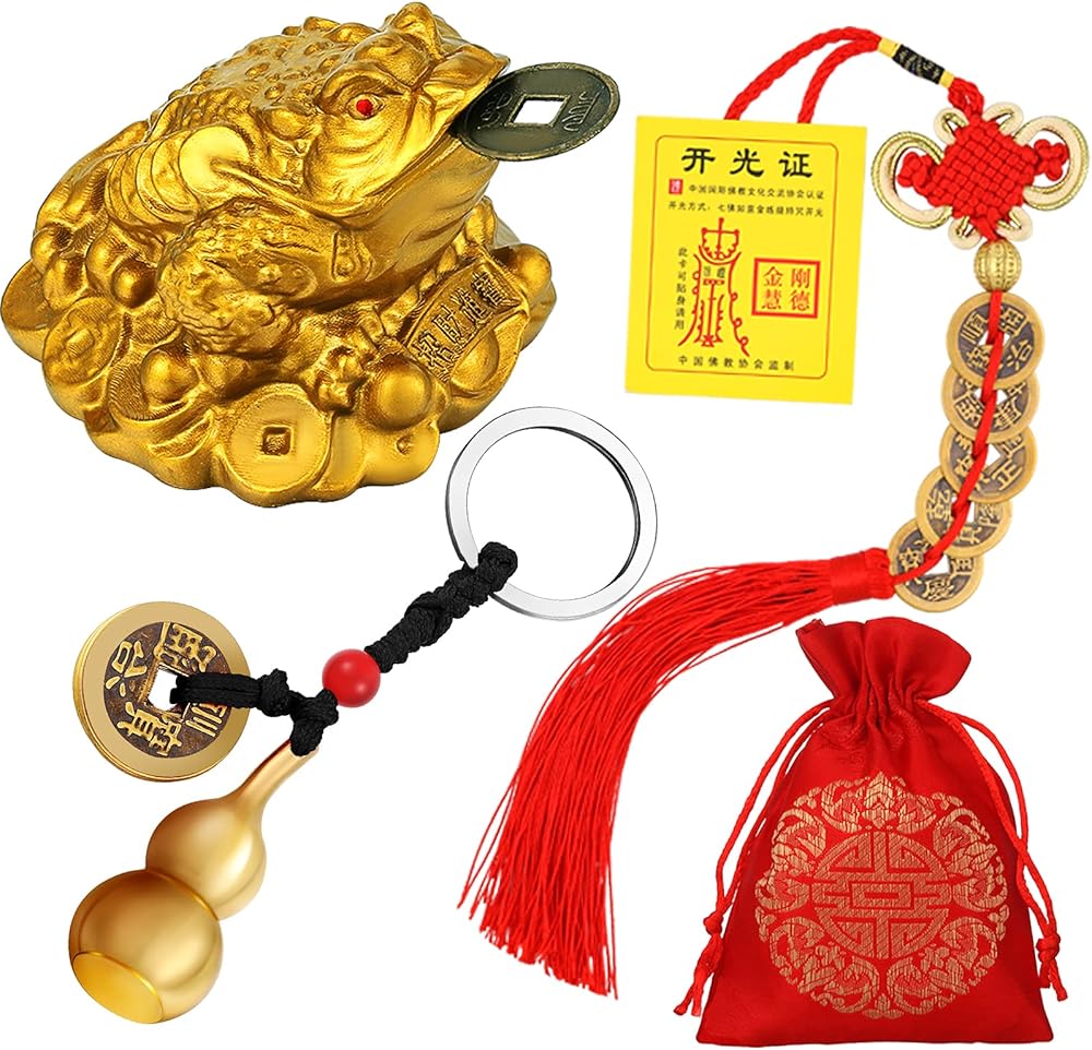 The Chinese knot lucky coins, Feng Shui brass Wu Lou with coins and Feng Shui money frog symbolize plentiful treasures and health enhancer and protector to guard you and prevent bad luck and accidents.