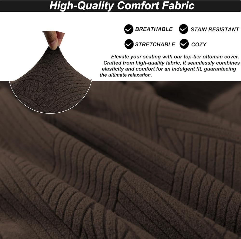High-Stretch Knitted Fabric:Crafted from high-stretch knitted fabric,our ottoman covers provide exceptional comfort and versatility.The fabric is soft,breathable,and resistant to wrinkles,offering a skin-friendly feel.Its remarkable stretchiness ensures a snug fit,while the durability makes it perfect for everyday use in various applications.