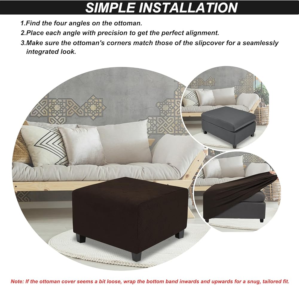 Selecting the Perfect Fit:Our Ottoman cover offers a variety of elegant designs and colors to enhance your home decor.To ensure a precise fit for your Ottoman,please measure your furniture dimensions before placing an order.The XX-Large size is suitable for ottomans with a length between 46"-52", width of 46"-52",and height of 15"-27".Please measure your ottoman before making a purchase.