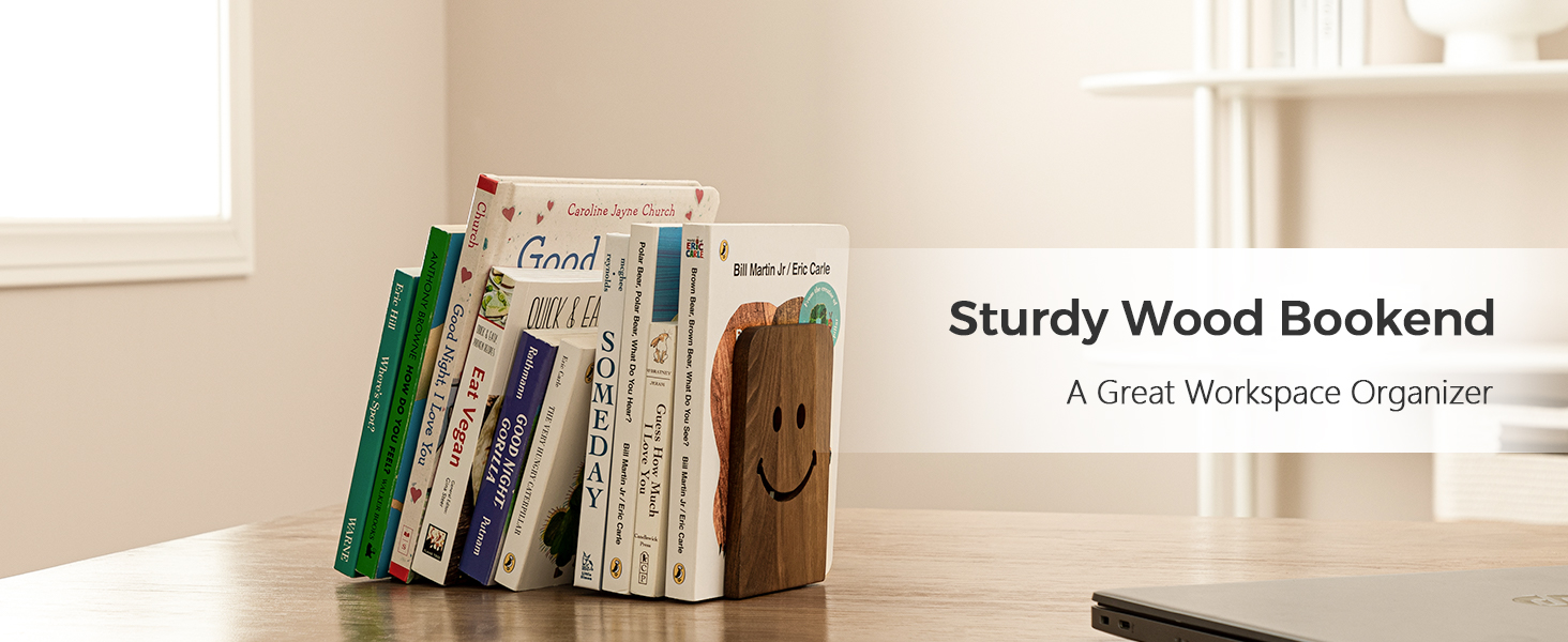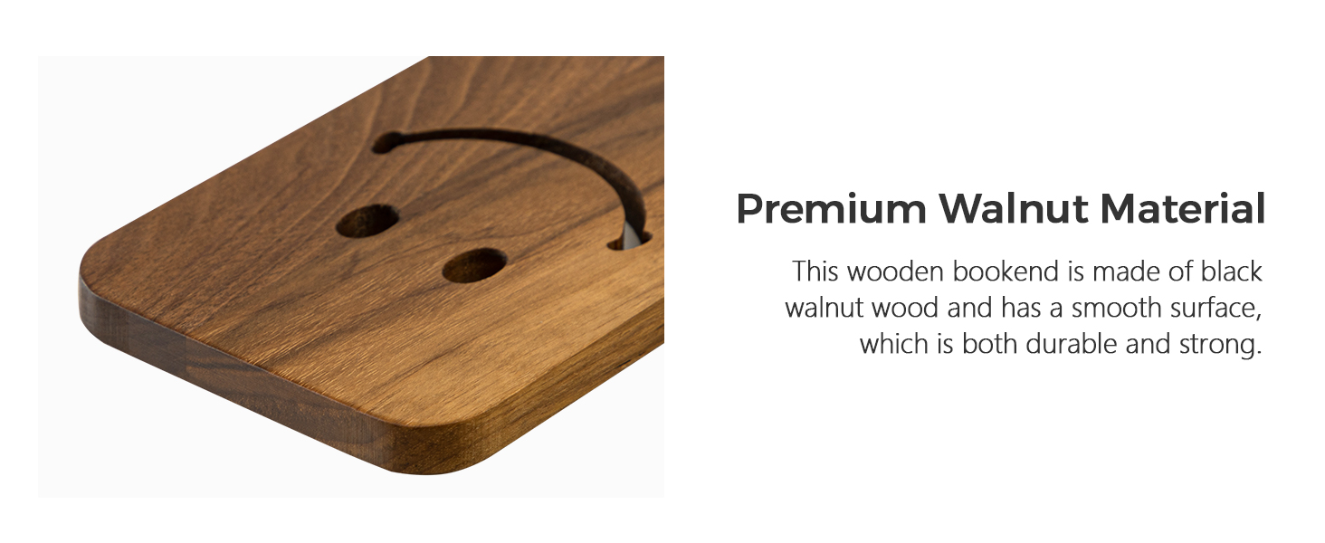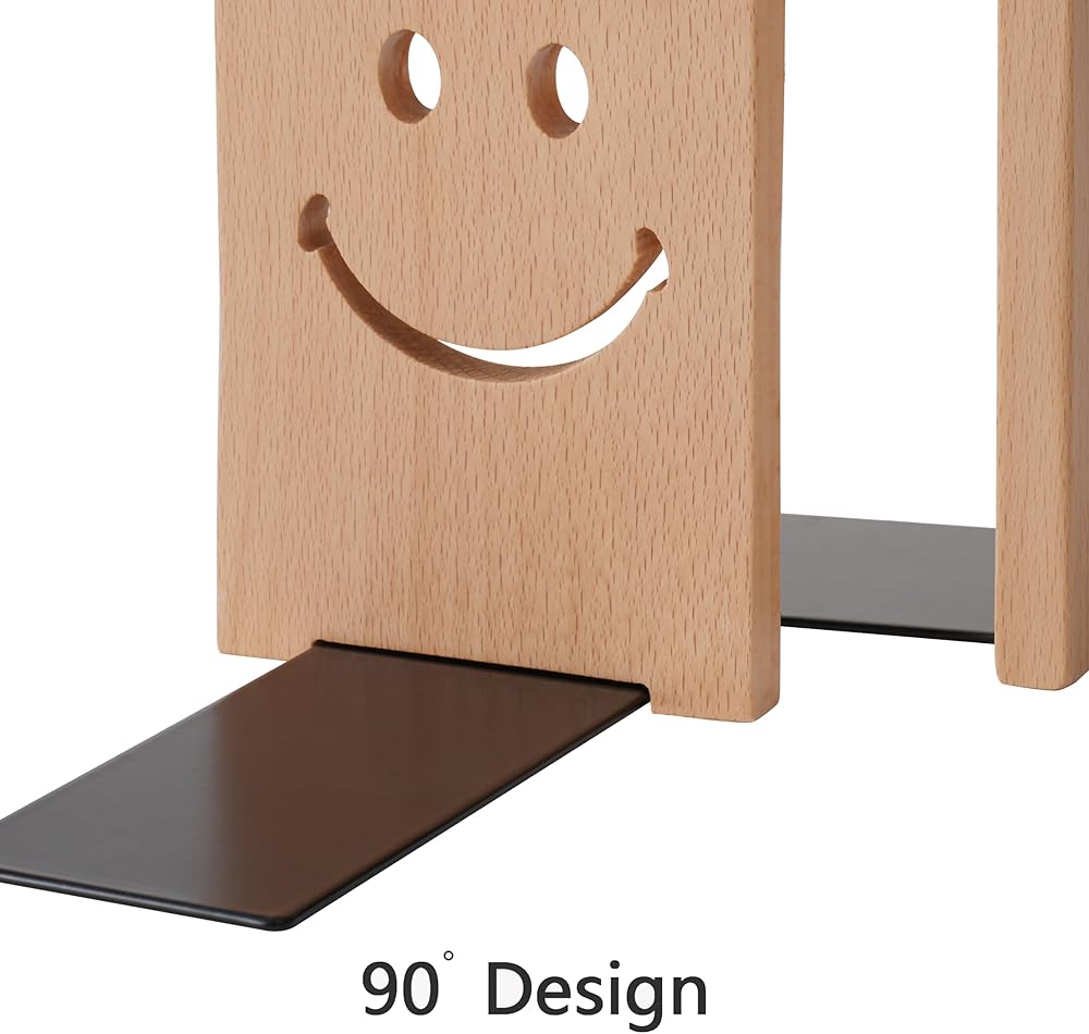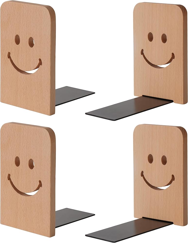Sunolga 2 Pairs Black Walnut Wood Book Ends with Non-Skid Pad and Detachable Design 5.1 Inches Heavy Duty Book Ends for Functional Organization and Decor, Desk Organizers and Accessories, Smiley Face