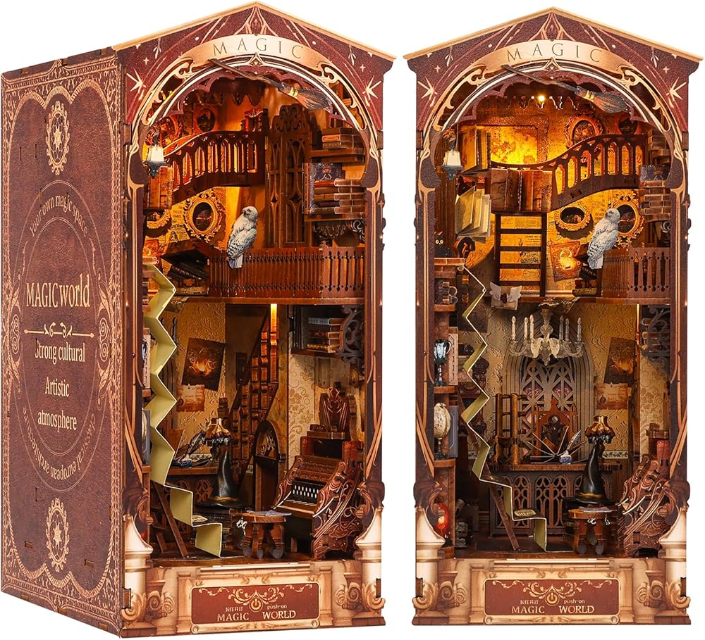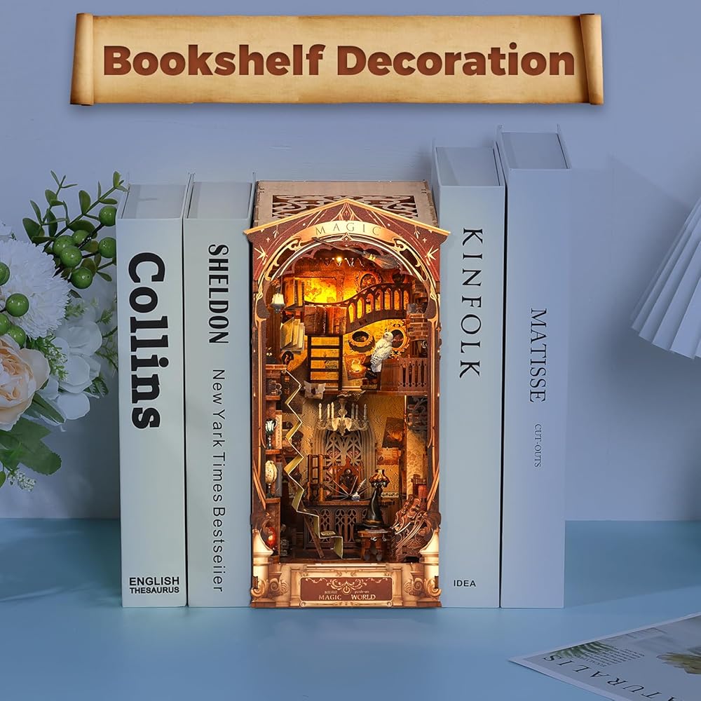 DIY Book Nook Kit, Decorative Bookend, 3D Wooden Puzzle Booknook Crafts, Bookshelf Insert Decor Alley with Furniture and LED Light for Birthday Home Desk Décor (Magic World)