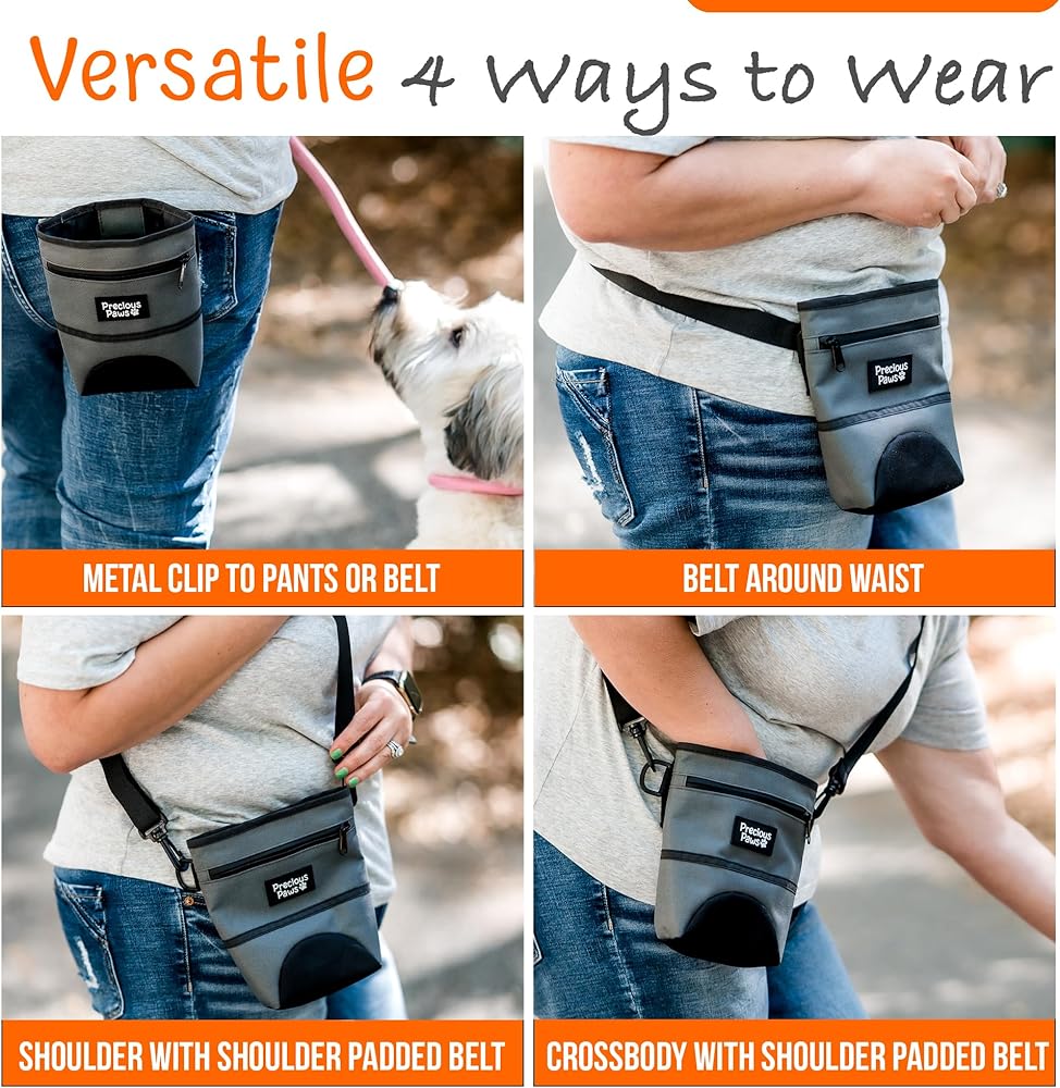 Four Ways to Wear our Treat Bag - Our dog treat pouch offers four versatile ways to wear it. Attach it to your belt with the metal waist belt clip, wear it crossbody or over your shoulder with the padded strap, or loop it around your waist with the adjustable belt. It's perfect for all your hands-free dog training needs.