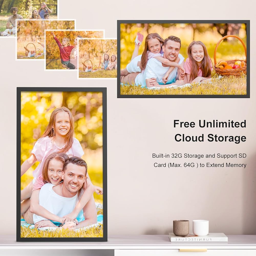 【High Definition & Large Capacity】 The digital photo album have a high resolution 1920x1080 21.5-inch IPS LCD Screen with a 16:9 aspect ratio, providing an exceptional viewing experience. The digital picture frame has 32GB of built-in memory and supports up to 64GB of storage expansion via USB or SD Card.