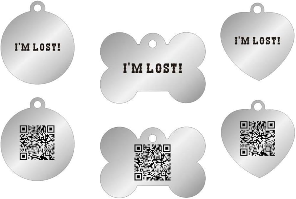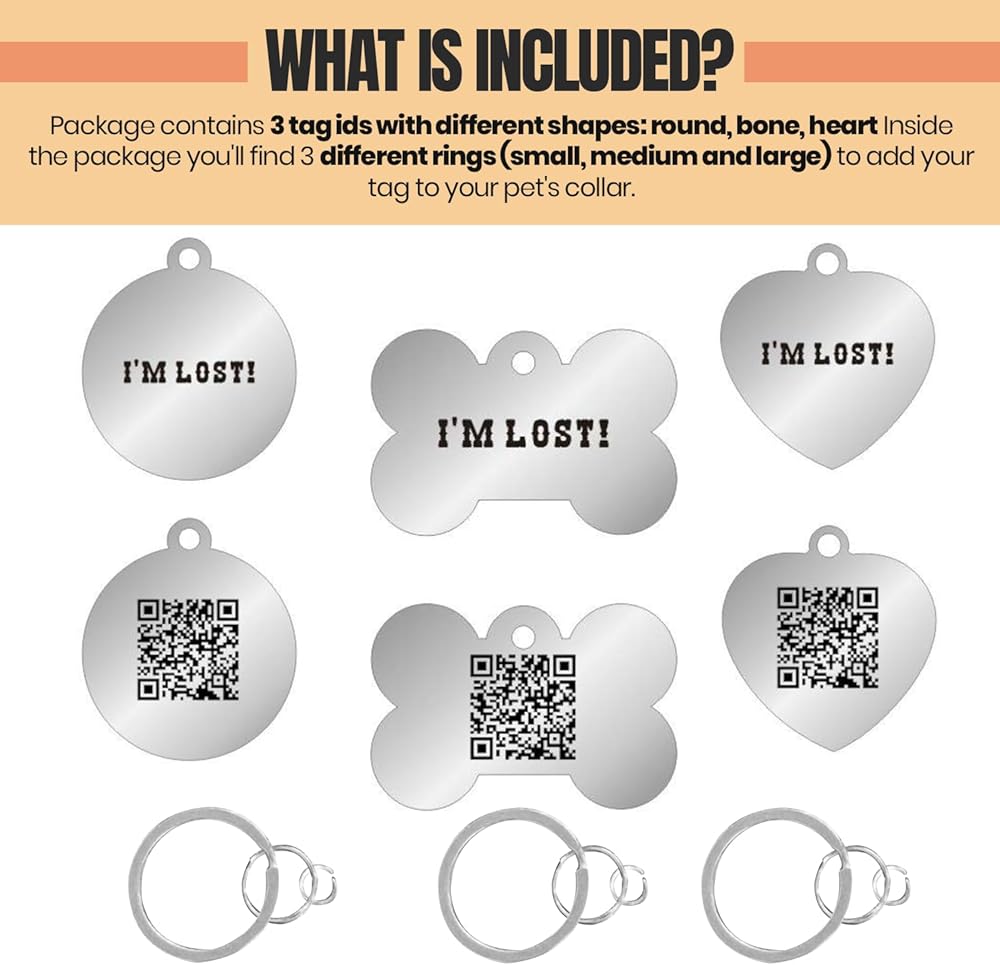 PET ID TAGS WITH QR CODE 3-PACK - You get 3 aluminum pet ID tags for cats and dogs, different shapes: bone, heart and rounded. You can scan the QR code and customize your tag with your information and pet photo.