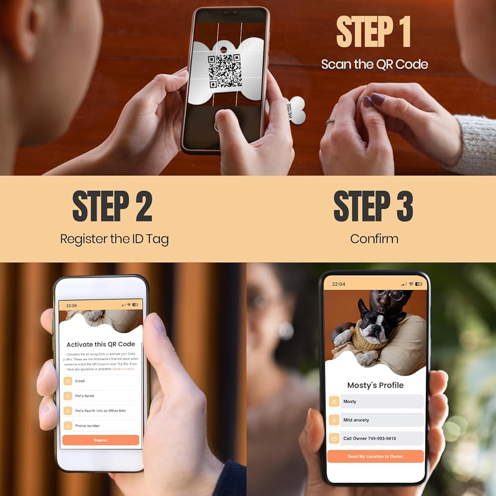 EASY 1-MINUTE SETUP & CUSTOMIZE - Quick and easy to setup, scan the QR Code add your information and click the button. You can customize the tag with your contact information, such as phone number, address and email, so that if your pet gets lost, someone can find you.