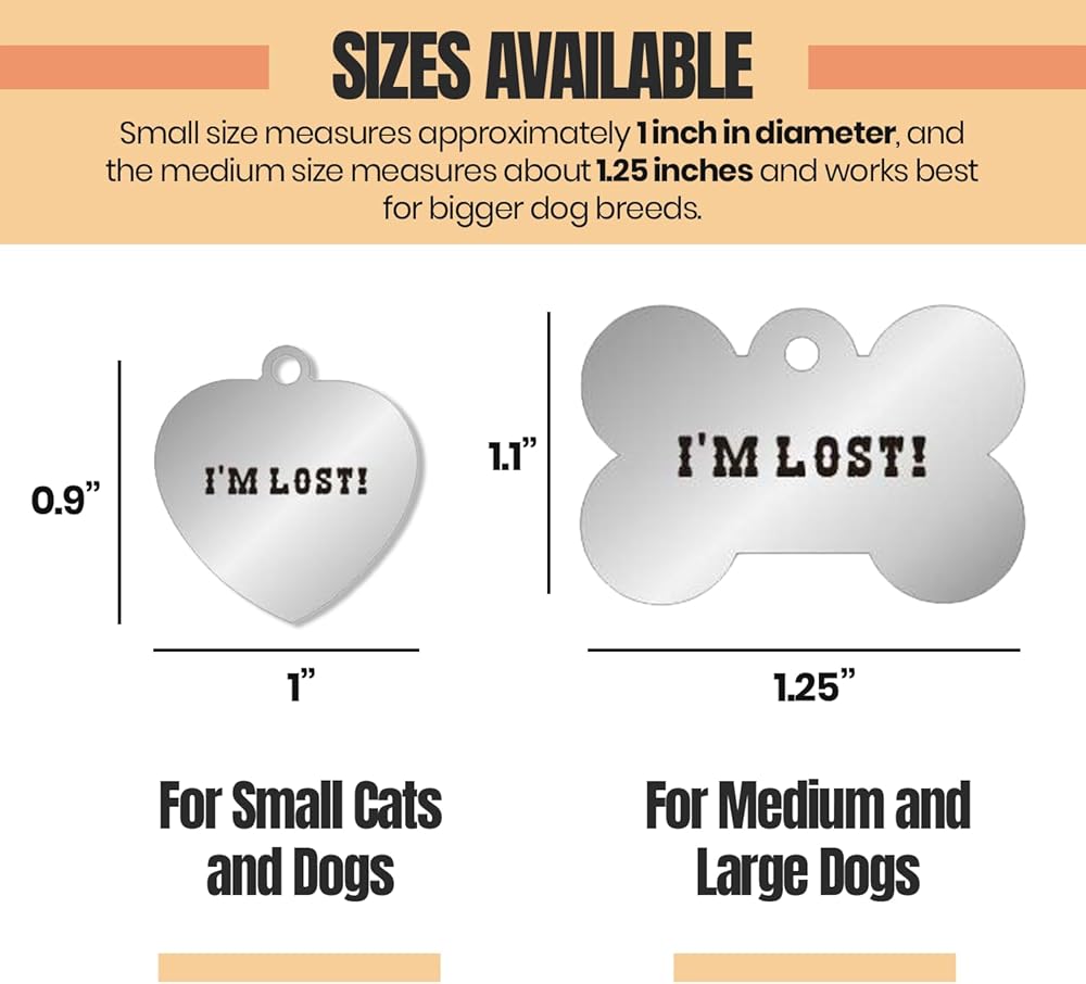 ID TAG SIZES - Recommended for cats and toy dog breeds, the small size measures approximately 1 inch in diameter, and the medium size measures about 1.25 inches and works best for bigger dog breeds