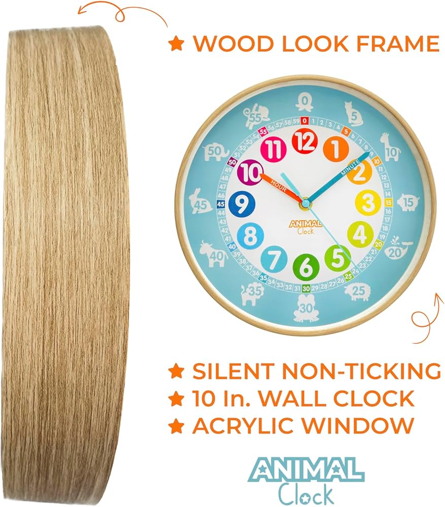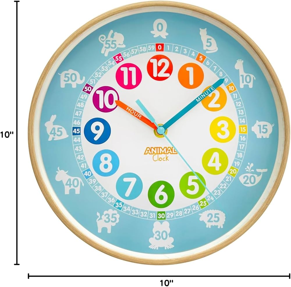 Animal Preschool Clock - Time Teacher 10 Inch Educational Silent Wall Clock with Wood Look Frame - Easy to Read Dial for Teacher's Classrooms, Preschooler's Bedroom & Children Playroom