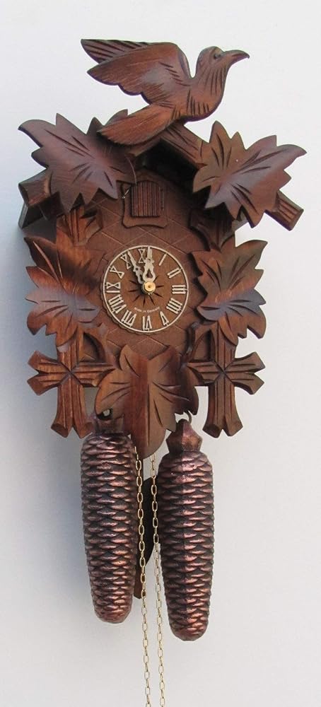 Eight-Day Carved Cuckoo Clock This cuckoo clock features: Hand-carved solid Linden wood case. Grape leaves, Maple leaves, carved bird top. Traditional walnut finish. 8-days on one winding. Dimensions: 8 x 12 x 6. Made in Germany. Certified by VdS. 2-year warranty. This charming and inexpensive cuckoo clock has leaves and a bird that are hand carved from solid Linden wood. The when the clock strikes the hour or half-hour, the door opens, a cuckoo appears and calls along with the clocks gong strike This clock is hand made in Germany. The mechanical brass movement is driven by two weights and time escapes with the tick of a traditional pendulum. The cuckoo call sound is made by two wooden whistles with bellows inside the clock case. Even the packaging has old-world charm, as only paper is used. The factory packing is all made with recycled materials.