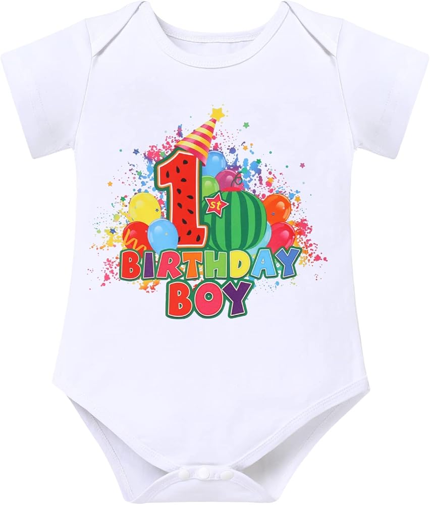 Birthday Romper Top Patterns: Watermelon ONE 1 Printed, Vibrant Colors with Melon "1st Birthday Boy", "2nd Birthday Boy", "3rd Birthday Boy", "4th Birthday Boy", "5th Birthday Boy"